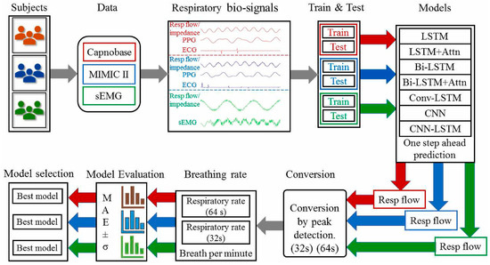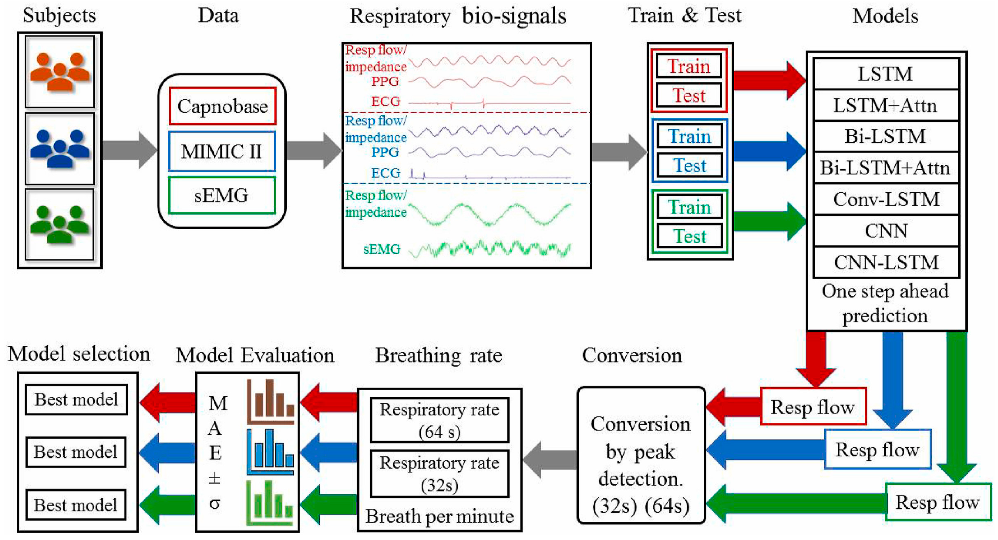 | Wearable biosignal sensors (ECG, PPG, sEMG) for RR prediction | Deep learning: LSTM, Bi-LSTM, Attention LSTM, CNN-LSTM, ConvLSTM; Bi-LSTM with Bahdanau attention best | Accurate respiratory rate prediction from biosignals | N/A (physiological regression task); MAE reported as performance metric (best MAE 0.24 ± 0.03 for PPG + ECG dataset) | Depends on dataset; models evaluated on clinical/public datasets | Model differentiates RR patterns effectively; sensor-dependent noise affects selectivity | Performance reported as MAE; no binary specificity since regression task | High accuracy RR prediction with deep models; works across ECG/PPG/sEMG data | Require quality biosignals; model complexity and computational needs; window length affects performance | [100] |