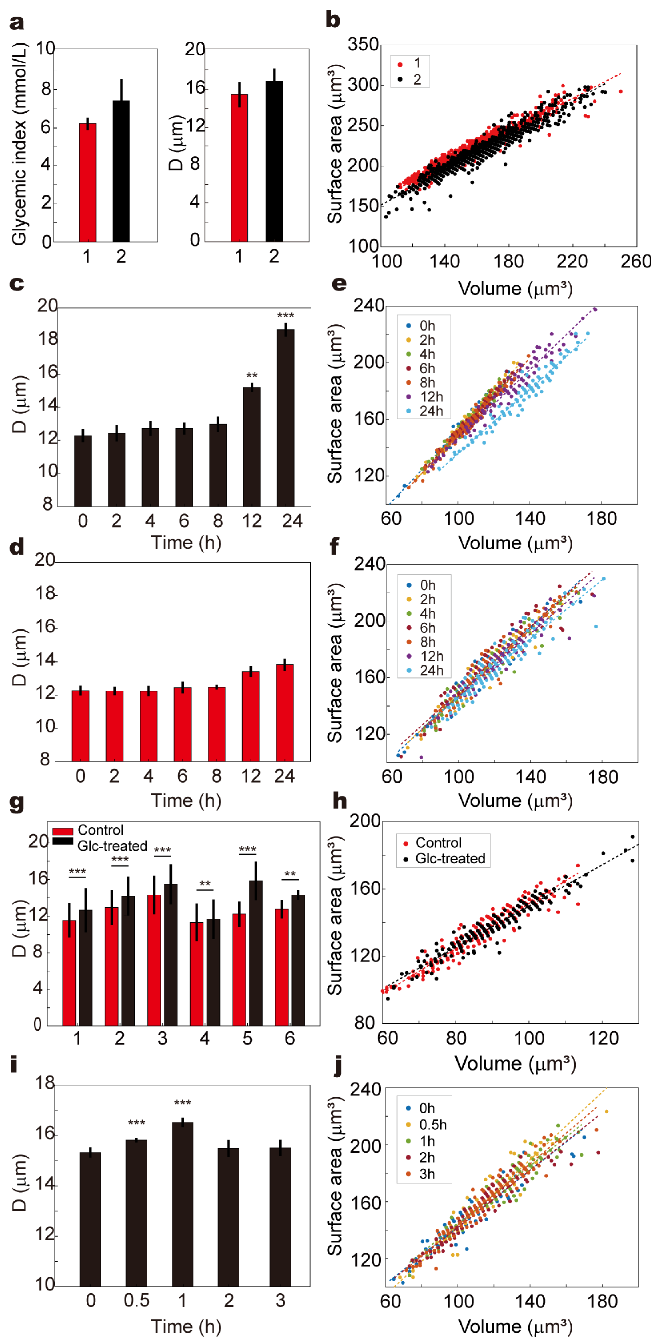 2 in Figure S1 as the origin); Figure S3: Scatter plot of the variation of the relationship between RBC surface area (S) and volume (V) under high glucose conditions in blood samples from six healthy volunteers (