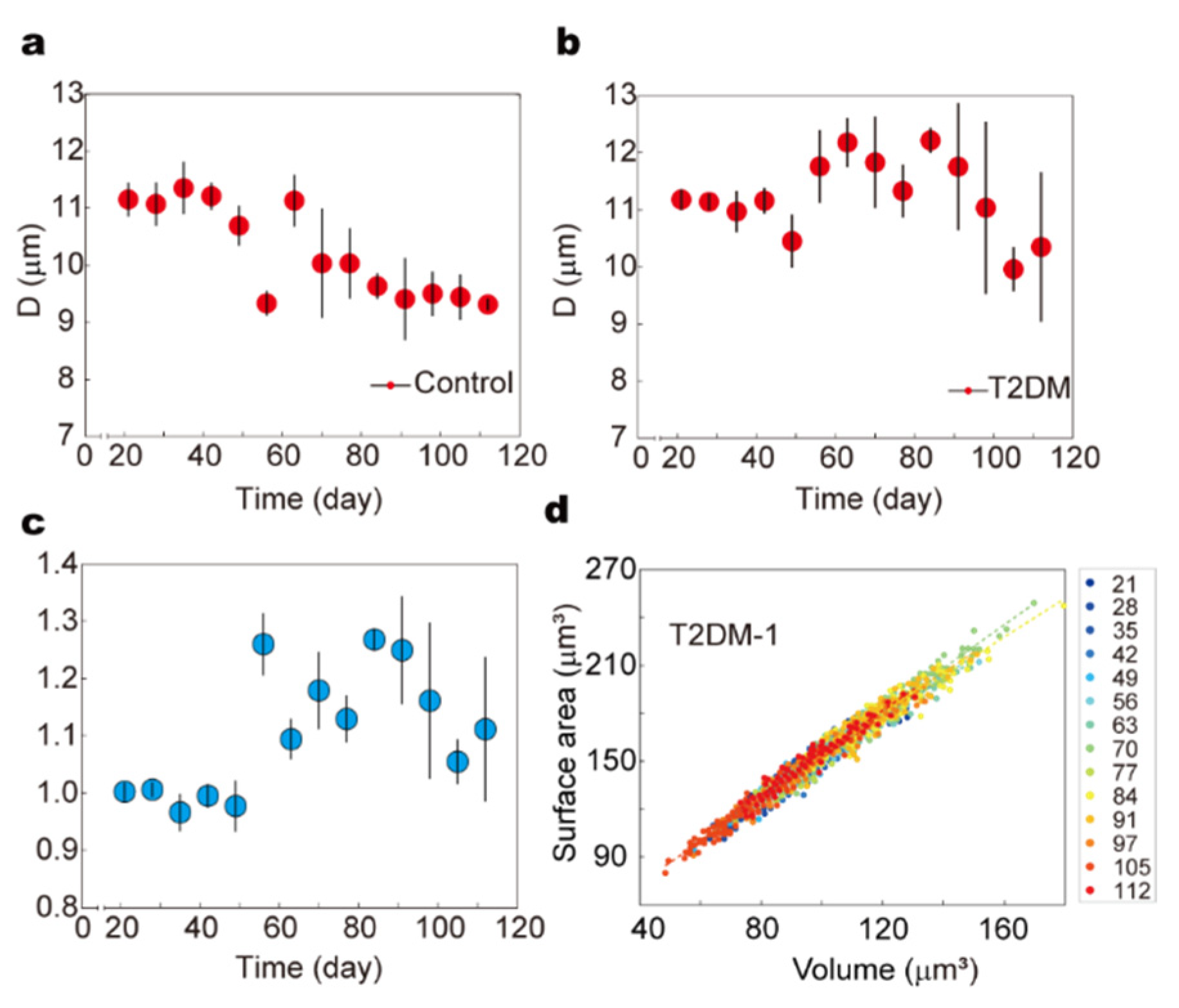 n = 200); Figure S4: Blood glucose levels of one volunteer during an oral glucose tolerance test (OGTT). Blood glucose concentrations (mmol/L) were measured at 0, 0.5, 1, 2, and 3 h after glucose ingestion; Figure S5: The variation of fasting blood glucose levels over time in control and type 2 diabetes mellitus (T2DM) mice. a. The variation of fasting blood glucose levels over time in control group mice. b. The variation of fasting blood glucose levels over time in type 2 diabetes mellitus (T2DM) mice; Figure S6: Scatter plot of the variation of the relationship between mouse RBC surface area (S) and volume (V) over time (