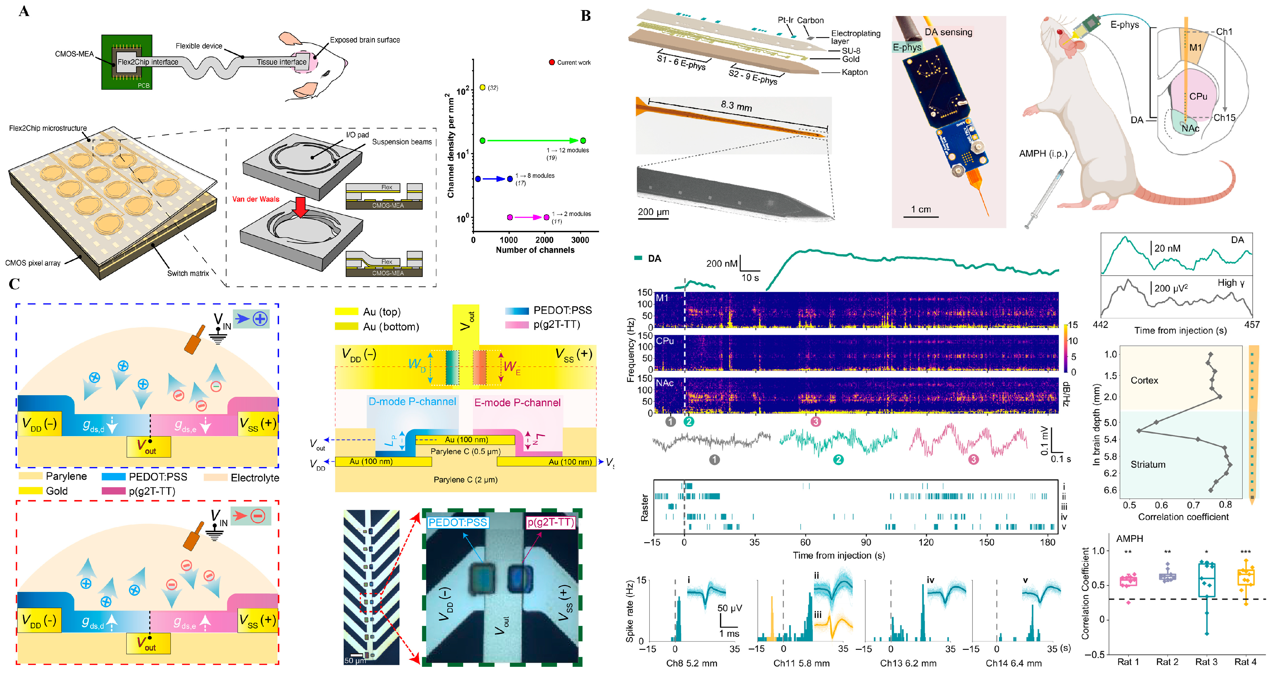 | Flexible Neural Interfaces | CMOS flexible probes, cIGT transistors | Soft, conformal, high-density recording |