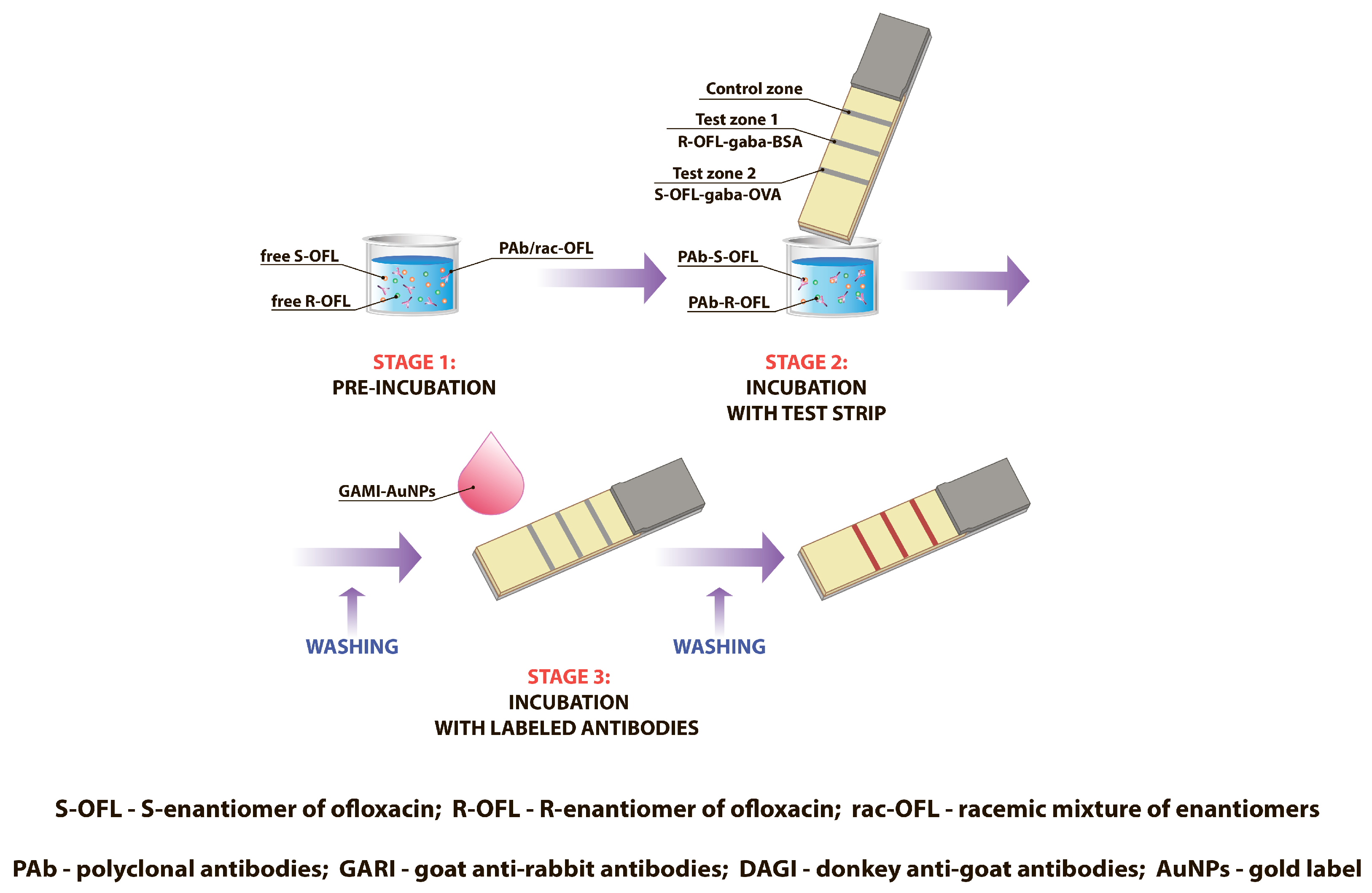 Taking all these factors into account (the widespread use of FQs, including OFL, in veterinary medicine, the possible transit and accumulation of antibiotic residues in food products), and the fact that it is hardly possible to avoid the use of antibiotics in agriculture at present, it is critical to control their content in raw materials and finished food products. The above-mentioned features of the biological action of OFL enantiomers, as well as the specifics of pharmaceutical production, necessitate the control of both optical isomers of OFL (S- and R-), i.e., the enantioselective detection of the antibiotic. Chromatographic methods and capillary electrophoresis, traditionally used for this purpose, along with their well-known benefits (selectivity and sensitivity), have several disadvantages, such as the need for complex equipment, highly qualified personnel, and large resource costs [25,26,27]. This makes these techniques problematic for rapid (often just qualitative) analysis, which is required when a lot of real samples need to be monitored on-site. In this case, immunoanalytical methods based on highly specific antigen–antibody interactions appear to be a promising alternative. These include enzyme-linked immunosorbent assay (ELISA) and immunochromatographic detection (lateral flow immunoassay, LFIA) [28,29,30,31]. Possessing all the advantages of ELISA (sensitivity, specificity, and accuracy), LFIA is a faster, cheaper, and simpler technique. Unlike ELISA, it does not require any specialized equipment (except a conventional scanner and simple software for the quantitative evaluation of the assay results), additional reagents, or specialized operator skills. The analytical tool is an immunochromatographic test strip, which is a multimembrane composite with pre-applied immunoreagents. The analysis involves incubating the test strip with the sample for a short time (10–20 min) and visually assessing the results for the presence/brightness of colored bands resulting from immune interactions.