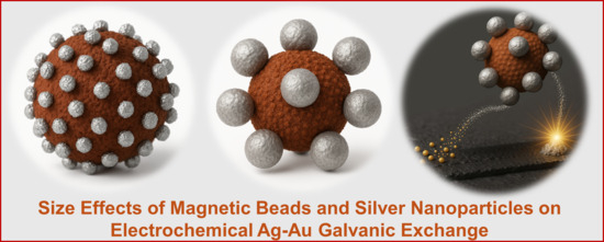 Despite these advances, limited studies have systematically examined how AgNP diameter and MB size influence the efficiency of silver-gold galvanic exchange and the resulting electrochemical response. To address these knowledge gaps, this study systematically investigates the effects of AgNP size (diameters of 20, 50, and 100 nm) and magnetic bead size (diameters of 100, 200, 1000, 3000, and 4500 nm) on the electrochemical signal output in two model aptamer-based magnetic immunoassays utilizing silver-gold galvanic exchange detection. Therefore, in this study we investigate how AgNP size influences the density of nanoparticle labeling on magnetic beads, the steric accessibility of the recognition layer, and the resulting assay sensitivity and reproducibility. By systematically examining these factors, our work provides new insights into the relationship between nanoparticle size, conjugation behavior, and electrochemical signal generation, offering design guidelines for more reliable and sensitive biosensing platforms.