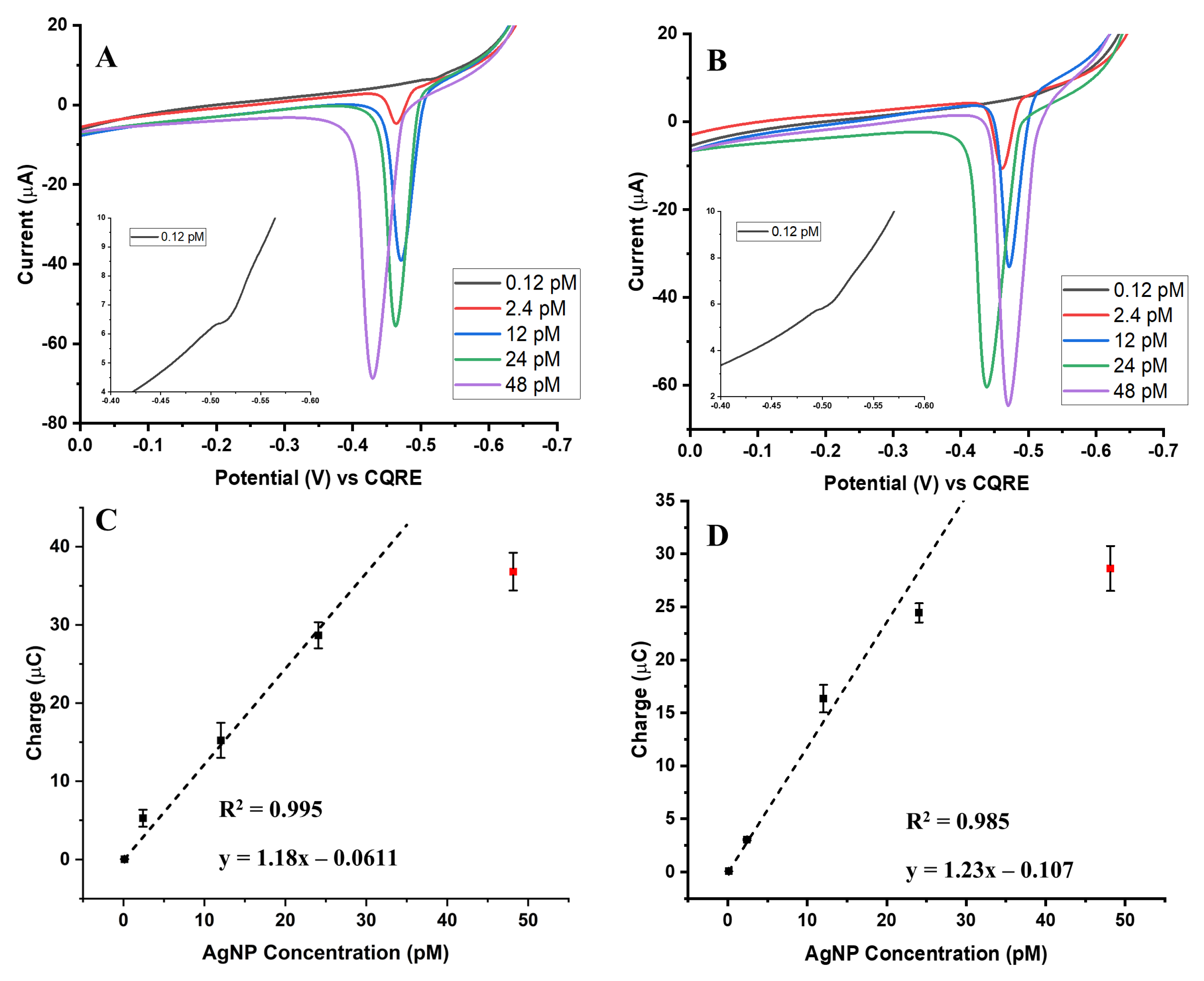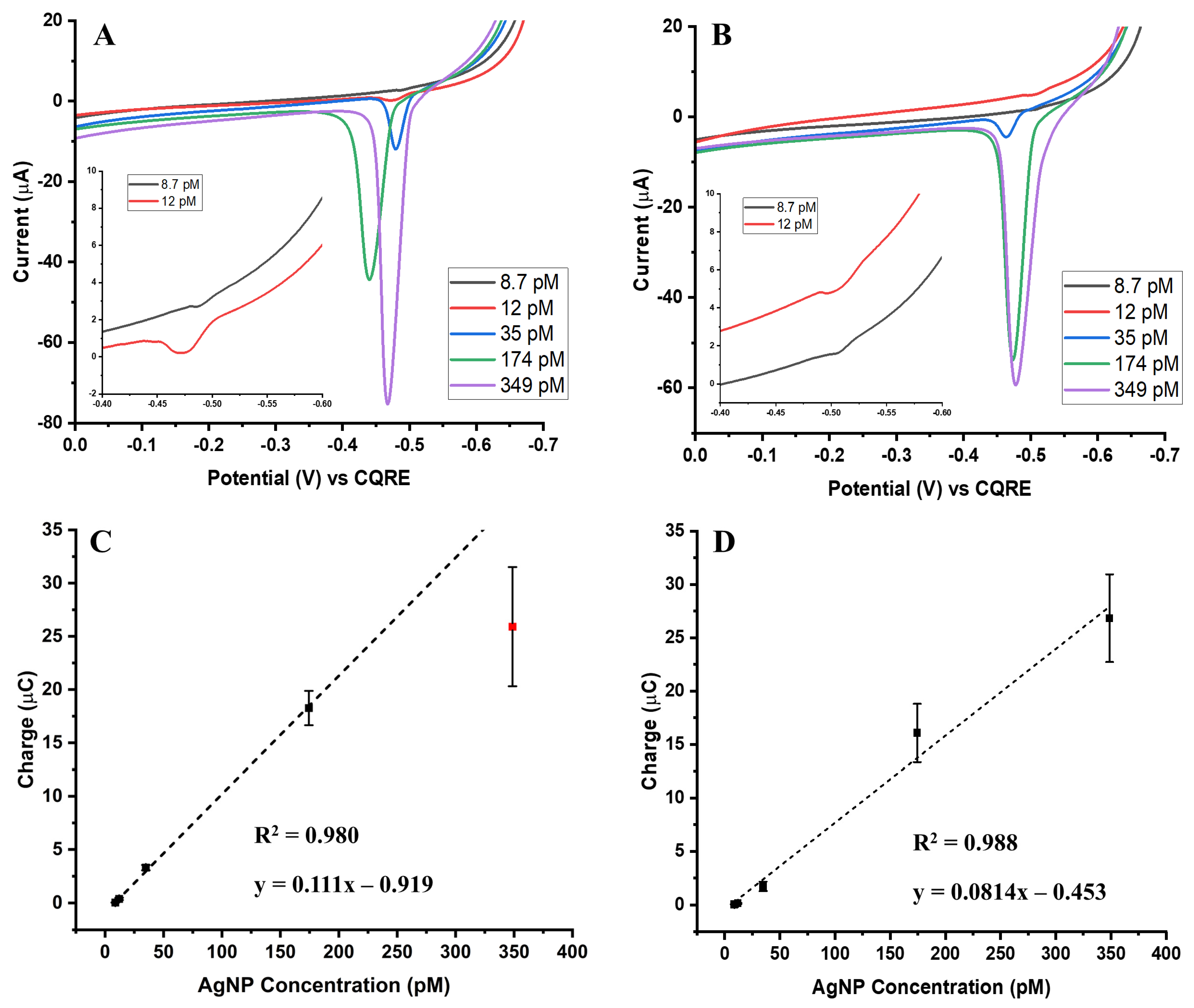 Importantly, the larger 100 nm AgNPs reached signal saturation more rapidly than the smaller 20 nm and 50 nm particles. This is reflected in the calibration slopes, which increased with particle size: approximately 0.1 µA/pM for 20 nm AgNPs, 1.2 µA/pM for 50 nm AgNPs, and 3.3–4.4 µA/pM for 100 nm AgNPs across both assay types. This behavior is explained by the greater silver mass contained within each individual nanoparticle: a single 100 nm particle contributes far more Ag atoms than a 20 nm or 50 nm particle. Consequently, the apparent signal increase is not solely due to the number of particles, but also reflects the total Ag mass delivered per binding event.