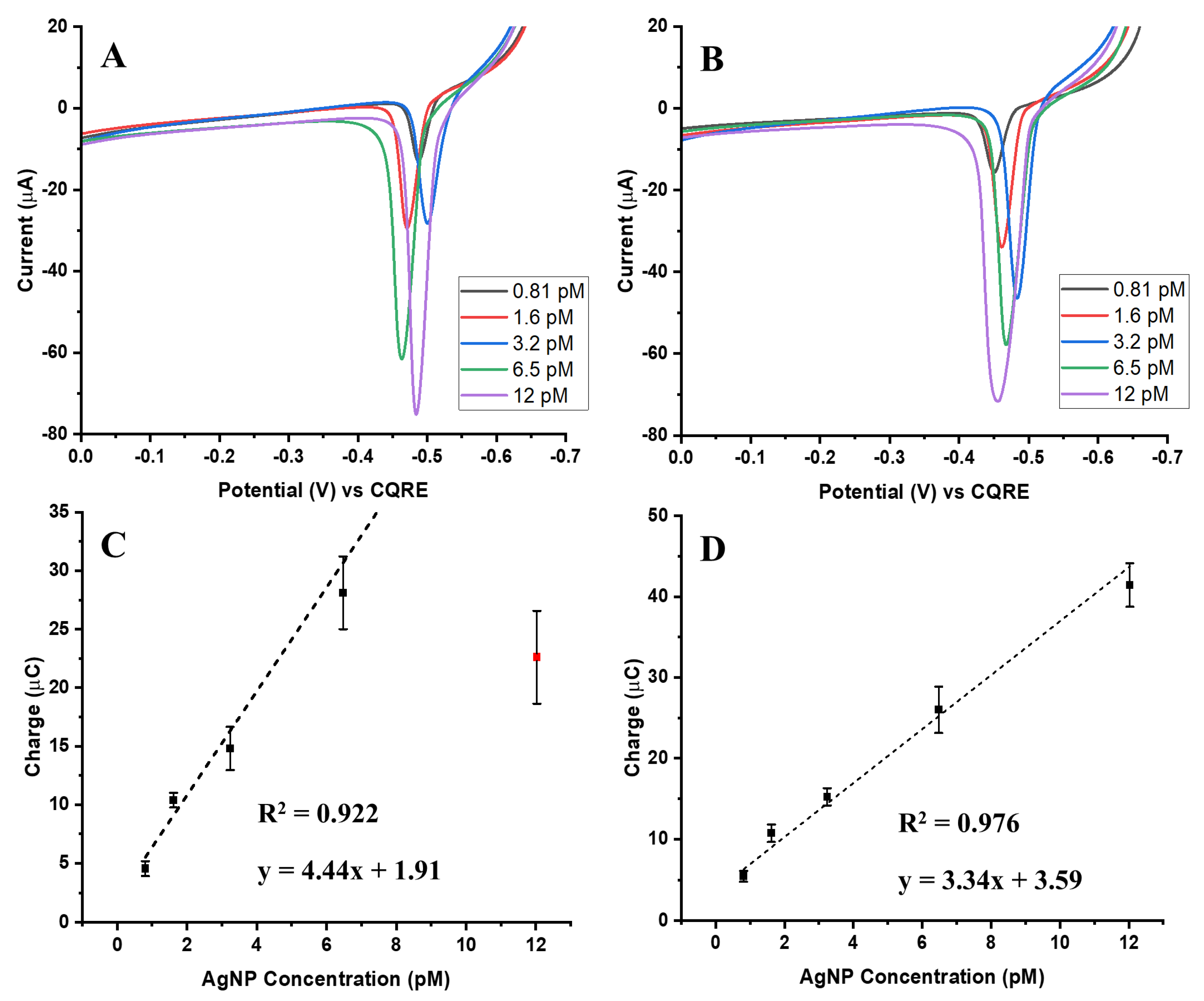 Figure 3A,B show this clear concentration-dependent response for both conjugation strategies. Calibration curves derived from the integrated oxidation charges (