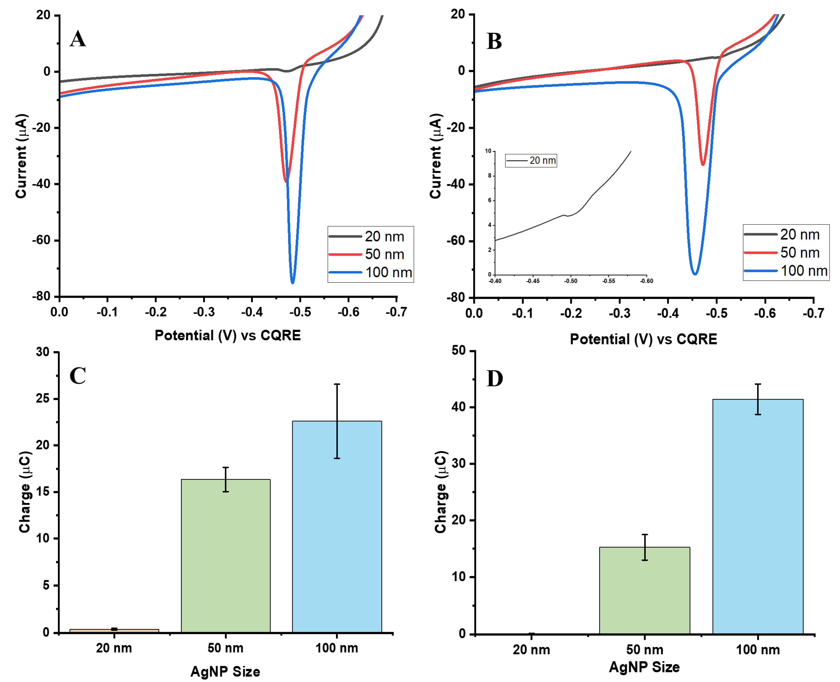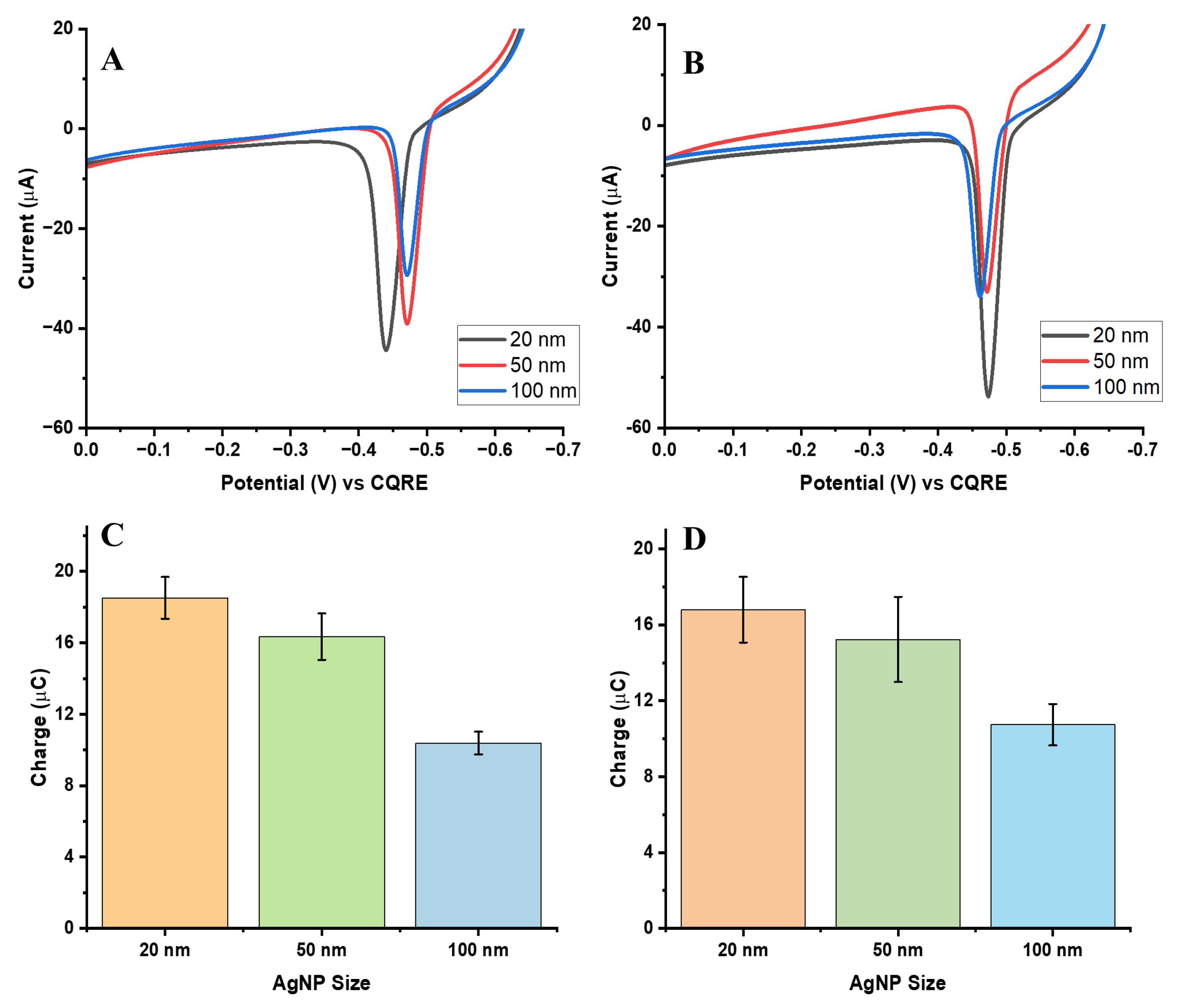 To directly compare electrochemical responses based on particle size, assays were normalized to the same number of AgNPs, ensuring that 20, 50, and 100 nm particles were present in equal counts. Based on the previously discussed calibration plots, a concentration of 12 pM was selected for all three sizes to eliminate variability in particle number and isolate the influence of nanoparticle size on the electrochemical signal.