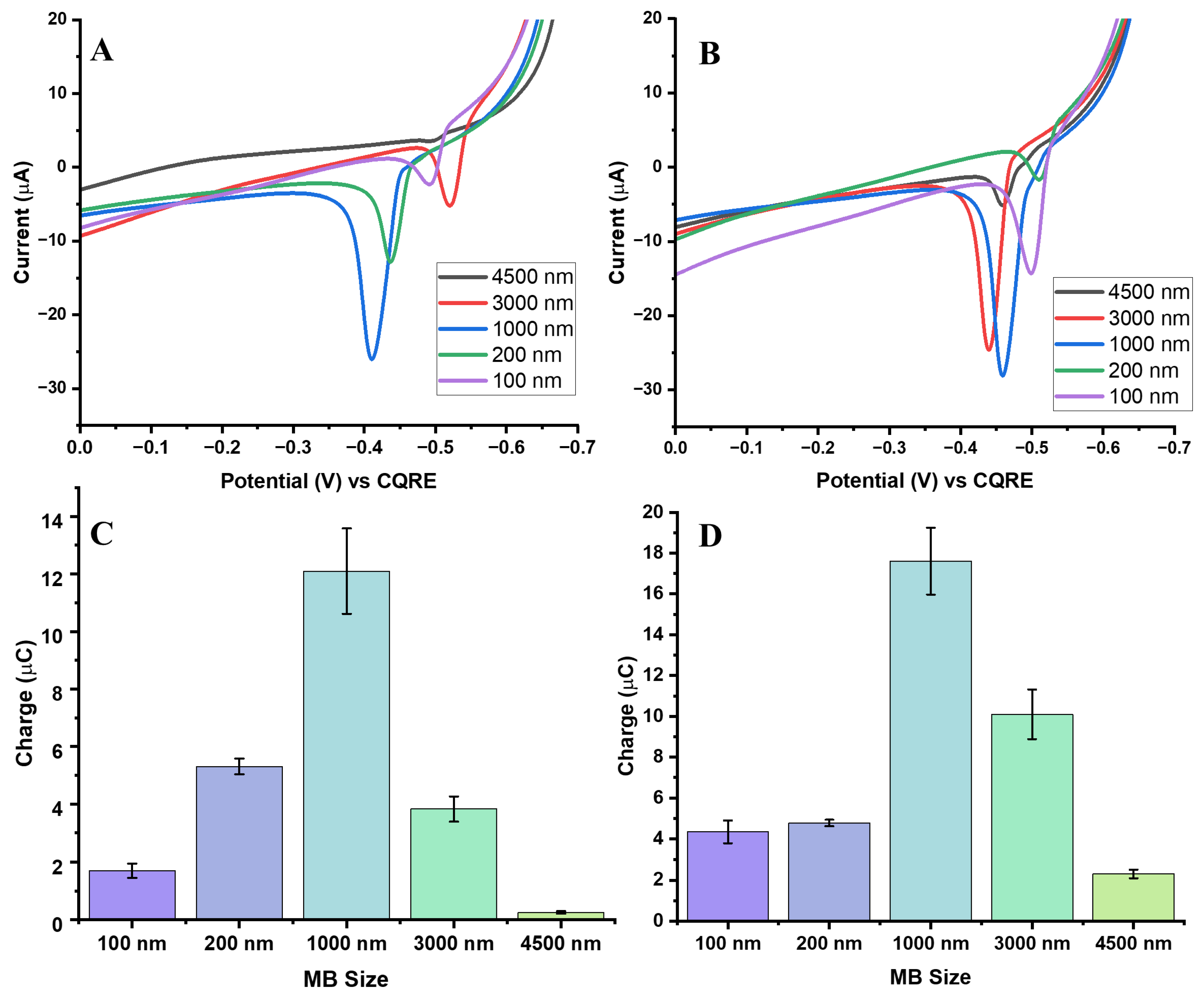Figure 7C,D display the charge distributions for the different MB sizes after surface area normalization. These results confirm that the 1000 nm beads consistently produced the most robust and reproducible signals, while the larger beads (3000 and 4500 nm) showed improved charge collection compared to mass normalization but remained less efficient overall. This reduced efficiency is likely due to their physical obstruction of the electrode surface, which hinders charge transfer despite their larger available surface area.