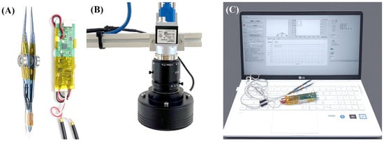 Overview of the biosensing system for quantitative measurement of passive ocular tension and rotation angle. (A) Passive tension measurement subsystem: forceps with integrated strain gauges connected to a custom-designed printed circuit board for signal acquisition and processing. (B) Rotation angle measurement subsystem: an infrared camera captured high-contrast images of the eye, and a custom LabVIEW application performed image processing and angle calculations. (C) Display unit: processed signals were transmitted via Bluetooth for real-time monitoring and data logging.