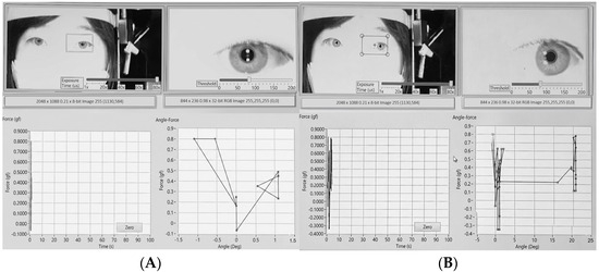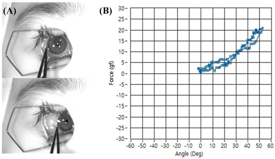Representative photograph of passive tension measurement during adduction of the right eye. (A) The conjunctiva near the limbus was grasped with forceps, and the eye was rotated horizontally past 40°. (B) The software simultaneously recorded passive tension and rotation angle in real time, producing a mechanical resistance profile. The difference in tension measurements at each angle during outward and return movements generated a separate trajectory (hysteresis loop), reflecting the viscoelastic properties of the eyeball rotation.