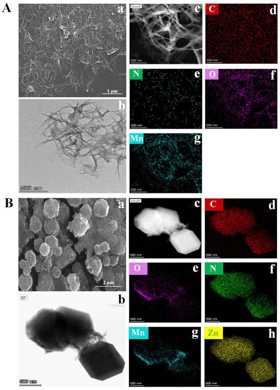 ESEM images (A(a)), TEM images (A(b)), and EDX results (A(c–g)) of MnxOy NWs. ESEM images (B(a)), TEM images (B(b)), and EDX results (B(c–h)) of MnxOy NWs@ZIF-8-RD.