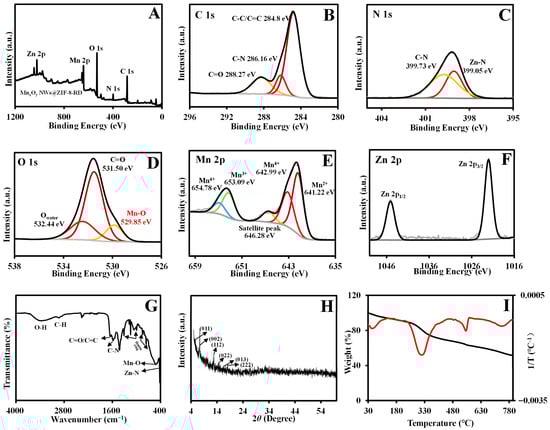 Characterizations of MnxOy NWs@ZIF-8-RD. XPS full spectra (A); C 1s (B), N 1s (C), O 1s (D), Mn 2p (E), and Zn 2p (F) spectra; FT-IR spectra (G); XRD results (H); TGA results (I) of MnxOy NWs@ZIF-8-RD. In subfigure (I), the black line represents the weight percentage (%) as a function of temperature, the red line represents the differential heat curve (1/T varies with temperature).