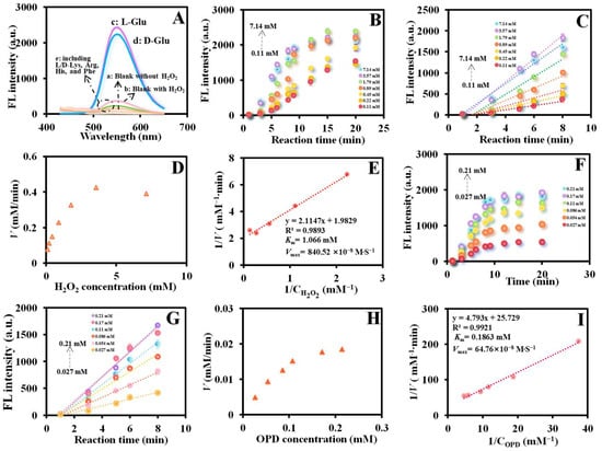 Feasibility analysis of Glu enantiomer recognition (A) based on MnxOy NWs@ZIF-8-RD. The relationship between different concentrations of H2O2 (0.11–7.14 mM) and fluorescence intensity with the reaction time varying from 1 to 20 min (B), the linear relationship between fluorescence intensity and reaction time (within 8 min) (C), Michaelis–Menten plot (D), and Lineweaver–Burk plot (E) based on the POD-like activity of MnxOy NWs@ZIF-8-RD. The relationship between different concentrations of OPD (0.027–0.21 mM) and fluorescence intensity with the reaction time varying from 1 to 20 min (F), the linear relationship between fluorescence intensity and reaction time (within 8 min) (G), Michaelis–Menten plot (H), and Lineweaver–Burk plot (I) based on the POD-like activity of MnxOy NWs@ZIF-8-RD. In subfigure (A), a, MnxOy NWs@ZIF-8-RD + OPD; b, MnxOy NWs@ZIF-8-RD + OPD + H2O2; c, MnxOy NWs@ZIF-8-RD + L-Glu + OPD; d, MnxOy NWs@ZIF-8-RD + D-Glu + OPD; e, MnxOy NWs@ZIF-8-RD + other AAs (including L/D-Lys, Arg, His, and Phe) + D-Glu.