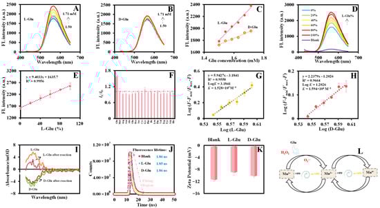 Fluorescence spectra of MnxOy NWs@ZIF-8-RD + OPD in the presence of different concentrations L-Glu (A) and D-Glu (B) varying from 1.50 to 1.71 mM, and the standard linear relationship between fluorescence intensity and Glu concentrations (C). Fluorescence spectra of MnxOy NWs@ZIF-8-RD + OPD in the presence of different enantiomeric percentage of L-Glu (D), and the standard linear relationship between fluorescence intensity and enantiomeric percentage of L-Glu (E). The influence of different amino acid enantiomers on the reaction solution (F). The linear fitting curves between the fluorescence intensity ratio (Log(F − Fmin)/(Fmax − F)) and Log[L-Glu] (G) and Log[D-Glu] (H). CD spectra (I), fluorescence lifetime (J), and zeta potential (K) results of MnxOy NWs@ZIF-8-RD + OPD with and without L/D-Glu. Catalytic process diagram (L) of the oxidation of Glu and OPD by MnxOy NWs@ZIF-8-RD. For subfigures (A,B), the concentrations of Glu represented by the purple line to the red line are 1.50, 1.54, 1.59, 1.63, 1.67, and 1.71 mM.