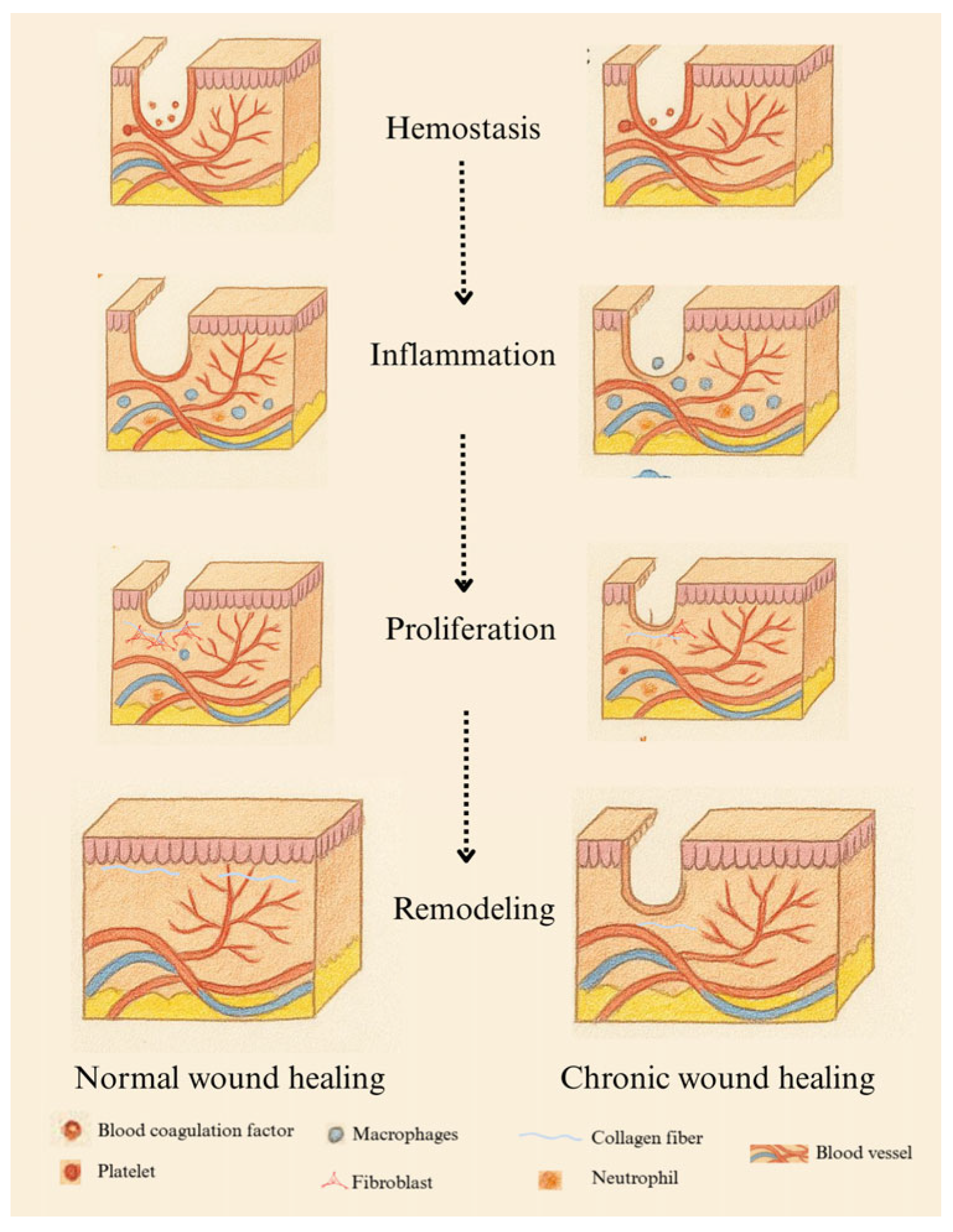 2]. These wounds fail to proceed through the normal stages of healing, hemostasis, inflammation, proliferation, and remodeling, resulting in prolonged patient suffering, increased risk of infection, and elevated morbidity and mortality [