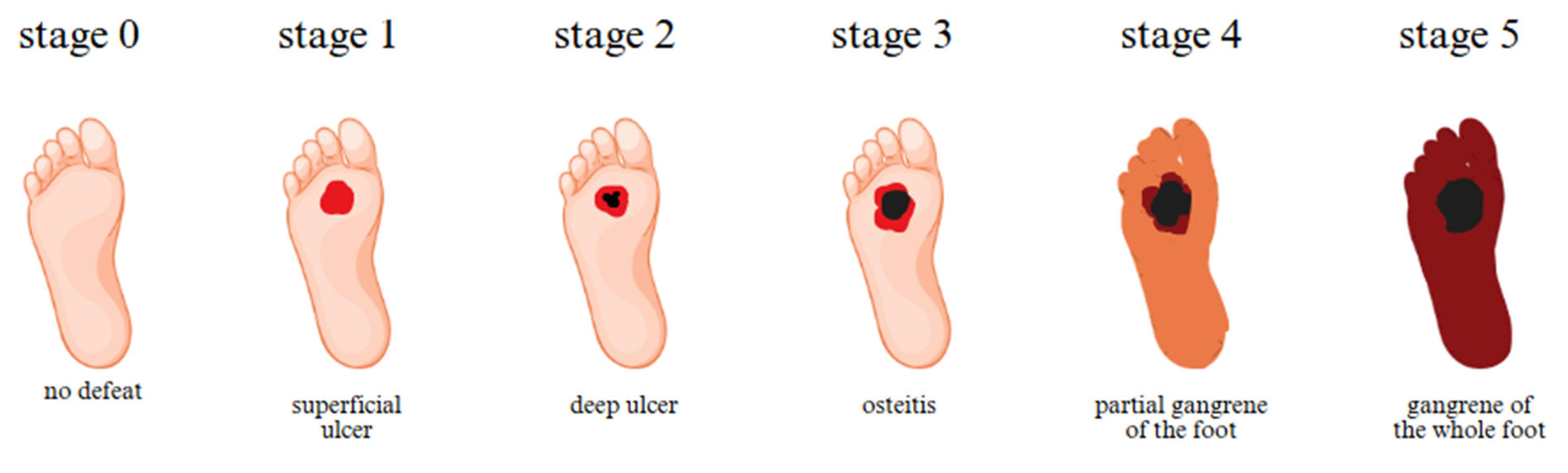 Figure 2, the progressive stages of diabetic foot ulcer development are illustrated, starting from stage 0 (no open lesions or healed lesions) to stage 5 (complete gangrene of the foot). Stage 1 represents a superficial ulcer, not penetrating into deeper tissue layers; stage 2 shows a deep ulcer extending to the tendon, bone, or joint; stage 3 depicts deep ulcers with infected tissues, also referred to as osteitis; stage 4 indicates partial gangrene of the foot; and stage 5 corresponds to gangrene affecting the entire foot.