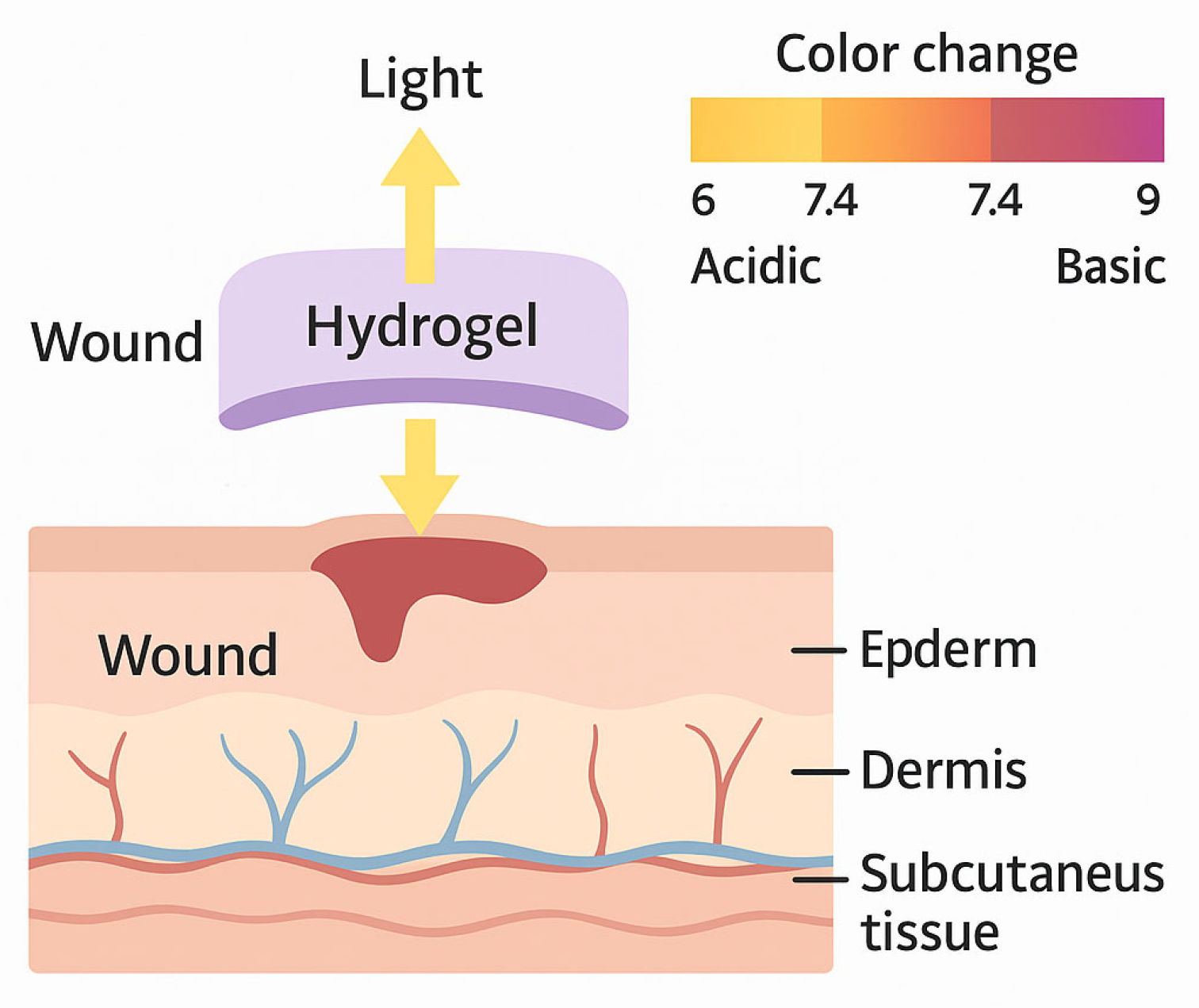 2]. Chronic wounds typically exhibit a more alkaline pH range of 7 to 9, correlating with an increased risk of infection and impaired healing. Hyaluronic acid (HA)-based hydrogels functionalised with pH-sensitive dyes such as phenol red or hydroxyl-substituted azobenzene provide a biocompatible and highly swollen matrix capable of real-time pH monitoring [