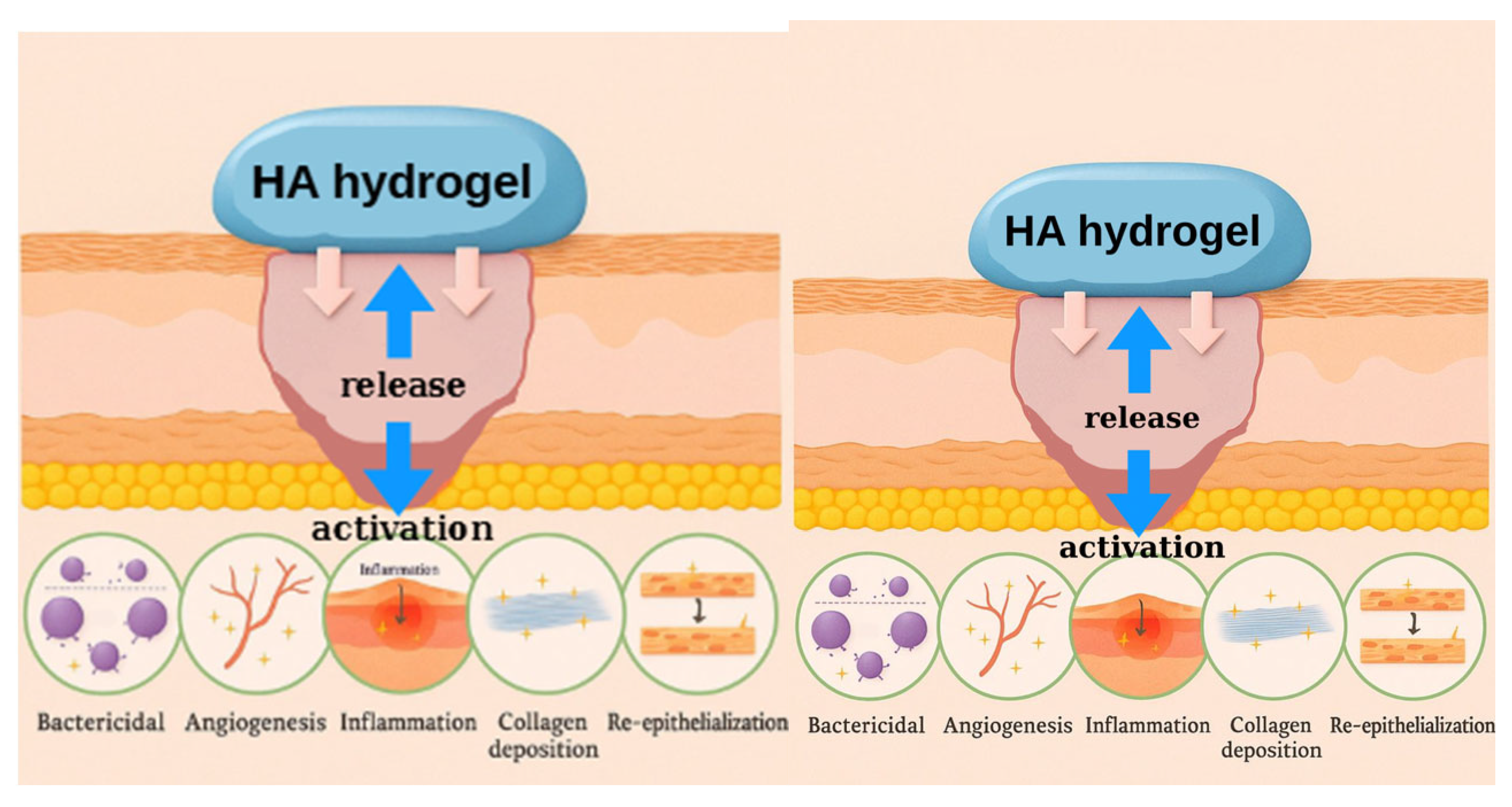 Hydrogels based on natural polymers, particularly hyaluronic acid (HA), have emerged as promising materials for wound dressings due to their excellent biocompatibility, hydrophilicity, and ability to mimic the native extracellular matrix (ECM) [