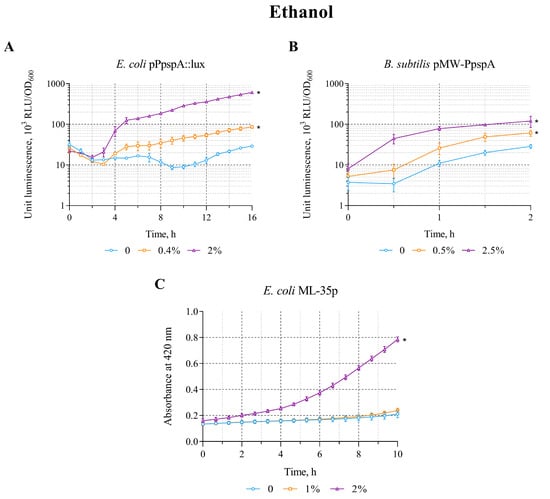 The response of biosensor strains to ethanol. (A) E. coli MG1655 (pPpspA::lux), (B) B. subtilis 168 (pMW-PpspA), and (C) E. coli ML-35p. (A,B)—The curves show the change in luminescence units of the biosensor cell response over time, which is expressed as the ratio of the average values of light emission (in Relative Light Units, RLU) measured at time t to its optical density (OD600) in the presence of various concentrations of ethanol. (C)—The kinetics of changes in the permeability of the cytoplasmic membrane of E. coli ML-35p during incubation with different concentrations of ethanol (1 and 2%) was determined by measuring the formation of o-nitrophenol at 420 nm after hydrolysis of the chromogenic marker ONPG by cytoplasmic bacterial β-galactosidase. The control measurements were carried out without the use of ethanol. All values were mean ± standard deviations (SD) for n = 3 (biological replicates). Significant differences were determined using one-way ANOVA followed by Tukey’s HSD post hoc test (p ≤ 0.05). Asterisks (*) indicate significant differences compared to the control sample (without chemicals). The same designations are used in the following figures.