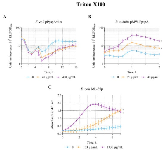 The response of biosensor strains to Triton X-100. (A) E. coli MG1655 (pPpspA::lux), (B) B. subtilis 168 (pMW-PpspA), and (C) E. coli ML-35p. All values were mean ± standard deviations (SD) for n = 3 (biological replicates). Significant differences were determined using one-way ANOVA followed by Tukey’s HSD post hoc test (p ≤ 0.05). Asterisks (*) indicate significant differences compared to the control sample (without chem-icals).