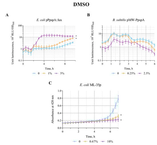 The response of the biosensor strains to DMSO. (A) E. coli MG1655 (pPpspA::lux), (B) B. subtilis 168 (pMW-PpspA), and (C) E. coli ML-35p. All values were mean ± standard deviations (SD) for n = 3 (biological replicates). Significant differences were determined using one-way ANOVA followed by Tukey’s HSD post hoc test (p ≤ 0.05). Asterisks (*) indicate significant differences compared to the control sample (without chem-icals).