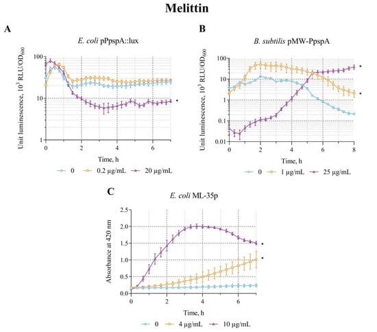 The response of the biosensor strains to Melittin. (A) E. coli MG1655 (pPpspA::lux), (B) B. subtilis 168 (pMW-PpspA), and (C) E. coli ML-35p. All values were mean ± standard deviations (SD) for n = 3 (biological replicates). Significant differences were determined using one-way ANOVA followed by Tukey’s HSD post hoc test (p ≤ 0.05). Asterisks (*) indicate significant differences compared to the control sample (without chem-icals).
