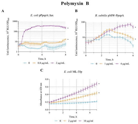 The response of the biosensor strains to polymyxin B. (A) E. coli MG1655 (pPpspA::lux), (B) B. subtilis 168 (pMW-PpspA), and (C) E. coli ML-35p. All values were mean ± standard deviations (SD) for n = 3 (biological replicates). Significant differences were determined using one-way ANOVA followed by Tukey’s HSD post hoc test (p ≤ 0.05). Asterisks (*) indicate significant differences compared to the control sample (without chem-icals). Summarized data on the influence of the studied compounds on the response of biosensor strains are presented in Table 3.