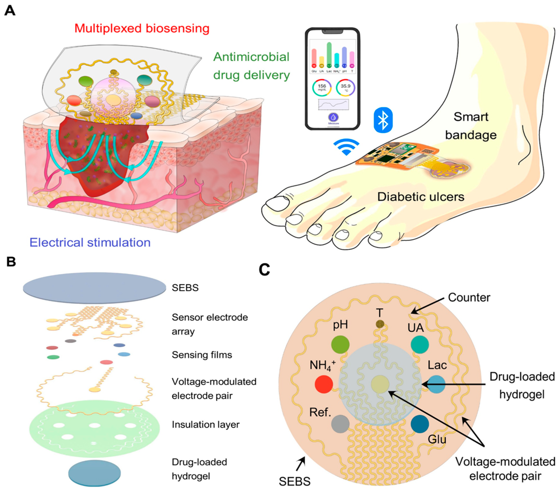 - Su, R.; Wang, L.; Han, F.; Bian, S.; Meng, F.; Qi, W.; Zhai, X.; Li, H.; Wu, J.; Pan, X.; et al. A highly stretchable smart dressing for wound infection monitoring and treatment. Mater. Today Bio 2024, 26, 101107. [Google Scholar] [CrossRef] [PubMed]