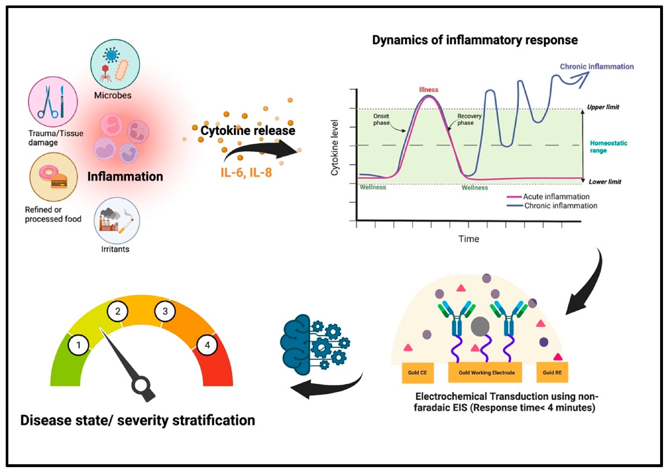 | Inflammation Monitoring | Immunoelectrochemical methods (labeled or label-free binding detection) | Multiplex compatibility and ultrasensitivity | Antibody instability and narrow dynamic range | Requires validation through in vivo inflammation models |