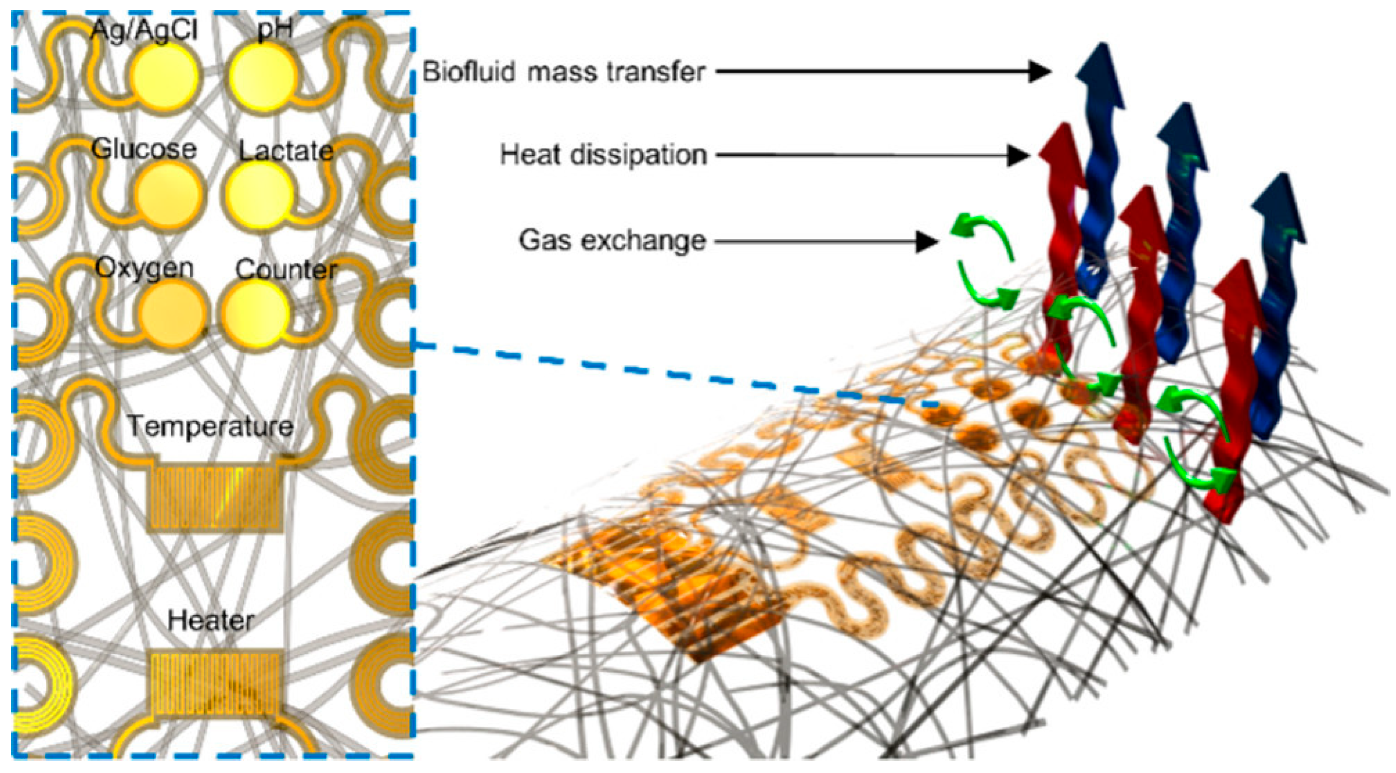 - Chu, H.; Hu, X.; Lee, C.-Y.; Zhang, A.; Ye, Y.; Wang, Y.; Chen, Y.; Yan, X.; Wang, X.; Wei, J.; et al. A wearable electrochemical fabric for cytokine monitoring. Biosens. Bioelectron. 2023, 232, 115301. [Google Scholar] [CrossRef] [PubMed]