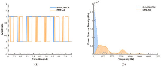 (a) Time domain waveforms of the BMEm3 and the corresponding m-sequence (N = 7 bits, Tc = 1/7 s). (b) Power spectral density of the m-sequence and BMEm3 (N = 31 bits, Tc = 1/800 s).