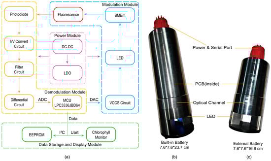 (a) The block diagram of the chlorophyll sensor. (b) The built-in battery configuration of chlorophyll sensor. (c) The external battery configuration of chlorophyll sensor.