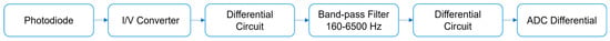 The sensor can be powered by a 12–24 V source. The external power supply undergoes step-down processing via DC-DC converters and Low-Dropout regulators (LDOs) to supply power to the analog and digital circuits of the sensor. The modulation module is primarily implemented through the microcontroller unit (MCU) chip LPC5536, controlling a constant current source circuit. By adjusting the digital-to-analog converter (DAC) output voltage, a constant current drive for the LEDs on both sides is achieved, and the excitation light modulation output is controlled by turning the LEDs on and off, ultimately obtaining the corresponding modulated fluorescence signal. After being focused by lenses and filtered, the fluorescence signal, primarily within the 670–700 nm wavelength range, enters the photodiode and is converted into an electrical signal. Through the I/V conversion stage implemented by a transimpedance amplifier, the weak current signal generated by the photodiode is converted into a voltage signal. Following this first stage and low-pass filtering, the signal undergoes differential amplification. The amplified signal passes through a conditioning circuit to filter out interference signals outside the 160–6500 Hz range. Subsequently, the signal is sent to an operational amplifier preceding the analog-to-digital converter (ADC) for secondary differentiation, further eliminating common-mode interferences such as ground noise. Finally, the MCU’s 16-bit successive approximation register ADC samples the output of the secondary differentiation at a speed of 320 kHz (Figure 4). In subsequent software calculations, these data are converted to an equivalent 25-bit resolution []. This high resolution is achieved computationally by adopting an oversampling and averaging strategy, similar to the design philosophy of Delta-Sigma ADCs. Specifically, the high-speed raw samples undergo sequential digital processing, including correlation demodulation and extensive accumulation. This process allows the final output data to attain a numerical precision equivalent to that of a 25-bit ADC. Subsequently, digital cross-correlation is performed between the sampled data and the locally stored BMEm sequence. This demodulation process coherently accumulates the desired synchronous fluorescence signal while averaging out asynchronous noise to achieve a high SNR. Finally, digital signal processing is performed to derive the numerical value representing the current Chl a concentration. After data processing, these final data are transferred via I2C to an EEPROM for data backup, fulfilling the requirements for self-contained detection. When the sensor is connected to a computer, these data can be transmitted via RS-485 to our custom-developed Chlorophyll Monitor software (V1). The Chlorophyll Monitor integrates essential functions such as serial communication, data storage, data display and replay, real-time clock synchronization, and instrument mode selection. In practical use, the software supports different data acquisition strategies depending on the operating mode: in online mode, it directly displays and records real-time fluorescence data. In self-contained mode, it functions as a data retrieval tool, reading historical data and time stamps from the EEPROM for post-analysis. Additionally, the software facilitates switching between the sensor’s working modes, including self-contained, online, and standby modes.