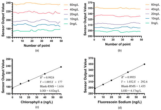 (a) Real-time detection results of the Chl a LOD experiment from the instrument output. (b) Real-time detection results of the fluorescein sodium LOD experiment from the instrument output. (c) The detection results of the Chl a LOD experiment for the chlorophyll sensor within the concentration range of 0–60 ng/L (n = 50). (d) The detection results of the fluorescein sodium LOD experiment for the chlorophyll sensor within the concentration range of 0–60 ng/L (n = 50).