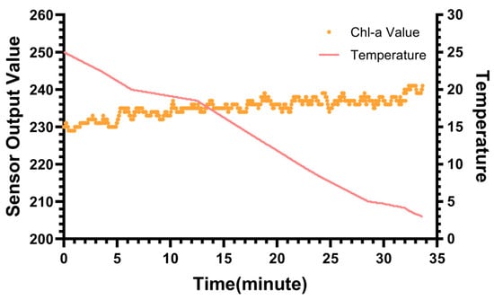 To evaluate the sensor’s baseline thermal stability under deep-sea conditions, a dedicated temperature experiment was performed. The sensor was immersed in a beaker containing ultrapure water and focused on instrumental baseline drift. The water temperature was regulated to gradually decrease from 25 °C to 3 °C. This temperature range was selected to simulate the vertical temperature gradient observed during deep-sea deployments in the South China Sea. The sensor’s output was recorded continuously to monitor baseline variations.