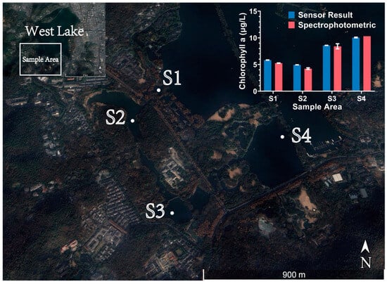 To verify the practical application performance of this sensor in a real and complex aquatic environment, we conducted in situ detection in West Lake, Hangzhou (sample area shown in Figure 10) and compared the results with the standard laboratory spectrophotometric method using collected water samples from four locations (S1–S4). In the analysis, the Chl a gain determined from laboratory calibration was used to convert the sensor’s readings into detected concentrations, which were then compared with the Chl a concentration values obtained from the spectrophotometric measurements.