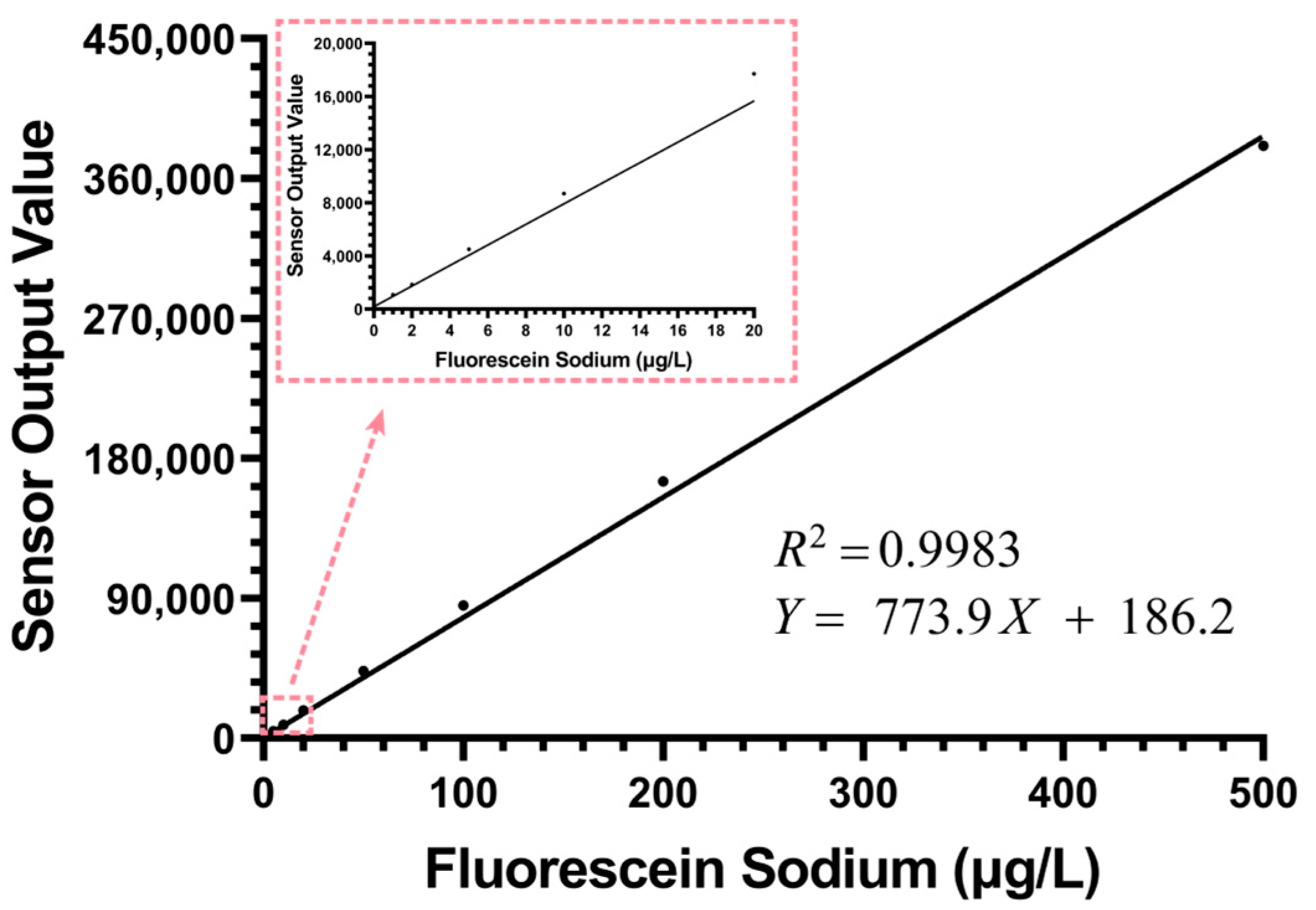 To comprehensively evaluate the sensor’s dynamic detection performance, we first conducted a wide-range linear calibration using fluorescein sodium standard solutions, covering a range of 0–500 μg/L.