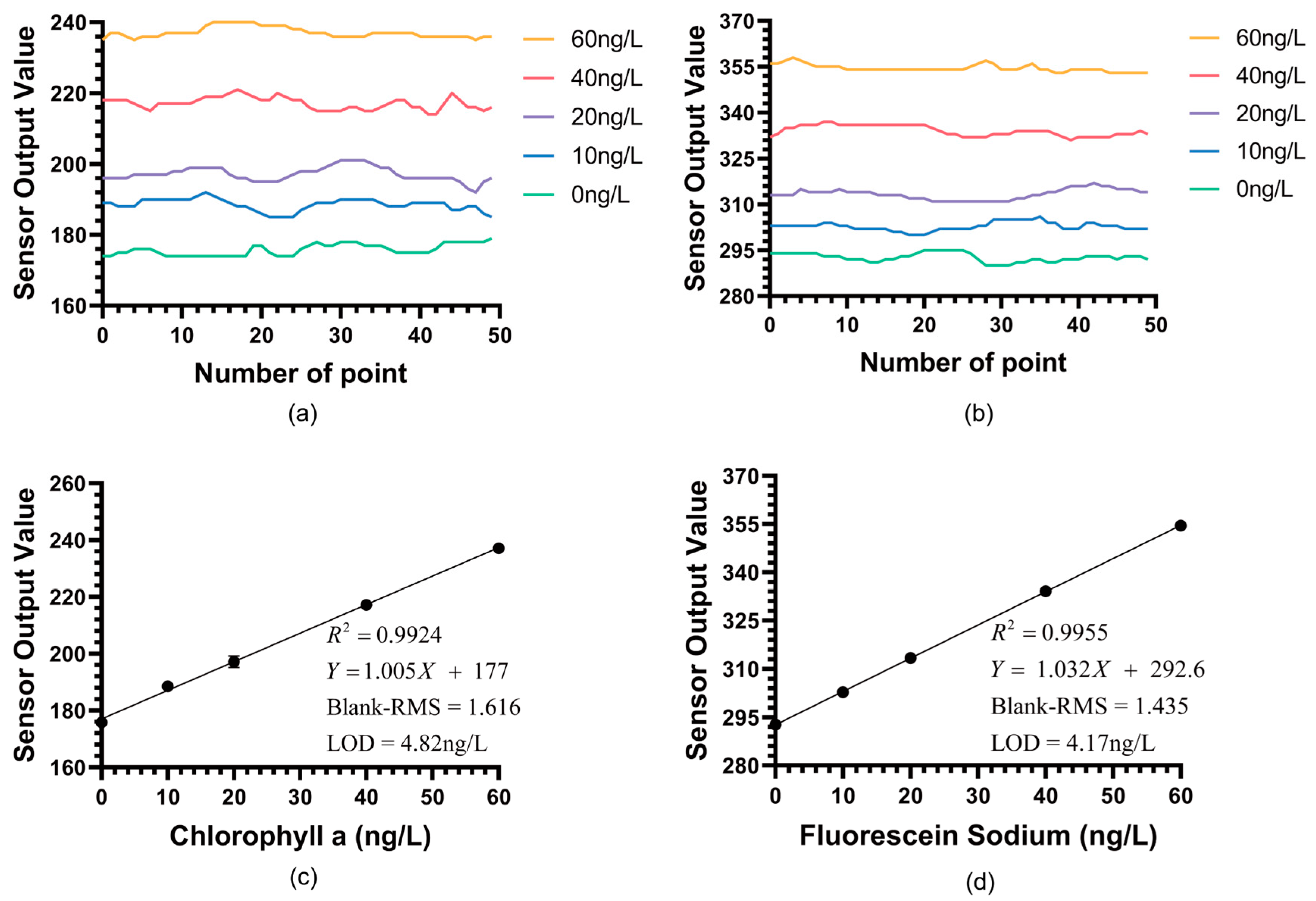 The high sensitivity of the sensor was also cross-validated by the detection results using the fluorescein sodium standard. When the RBRtridente was configured for the standard fluorescein detection channel, its LOD was 10 ng/L, whereas our sensor’s LOD for fluorescein sodium was only 4.17 ng/L. This superiority, demonstrated in a strict fluorescein sodium comparison, strongly corroborates that the 4.82 ng/L chl a detection limit measured using the spinach extract is a true and reliable performance metric.