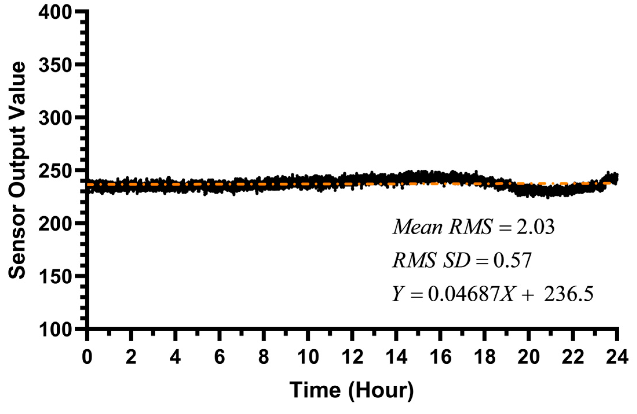 To comprehensively assess the sensor’s reliability during long-term continuous operation, a 24-h stability experiment was conducted. As shown in