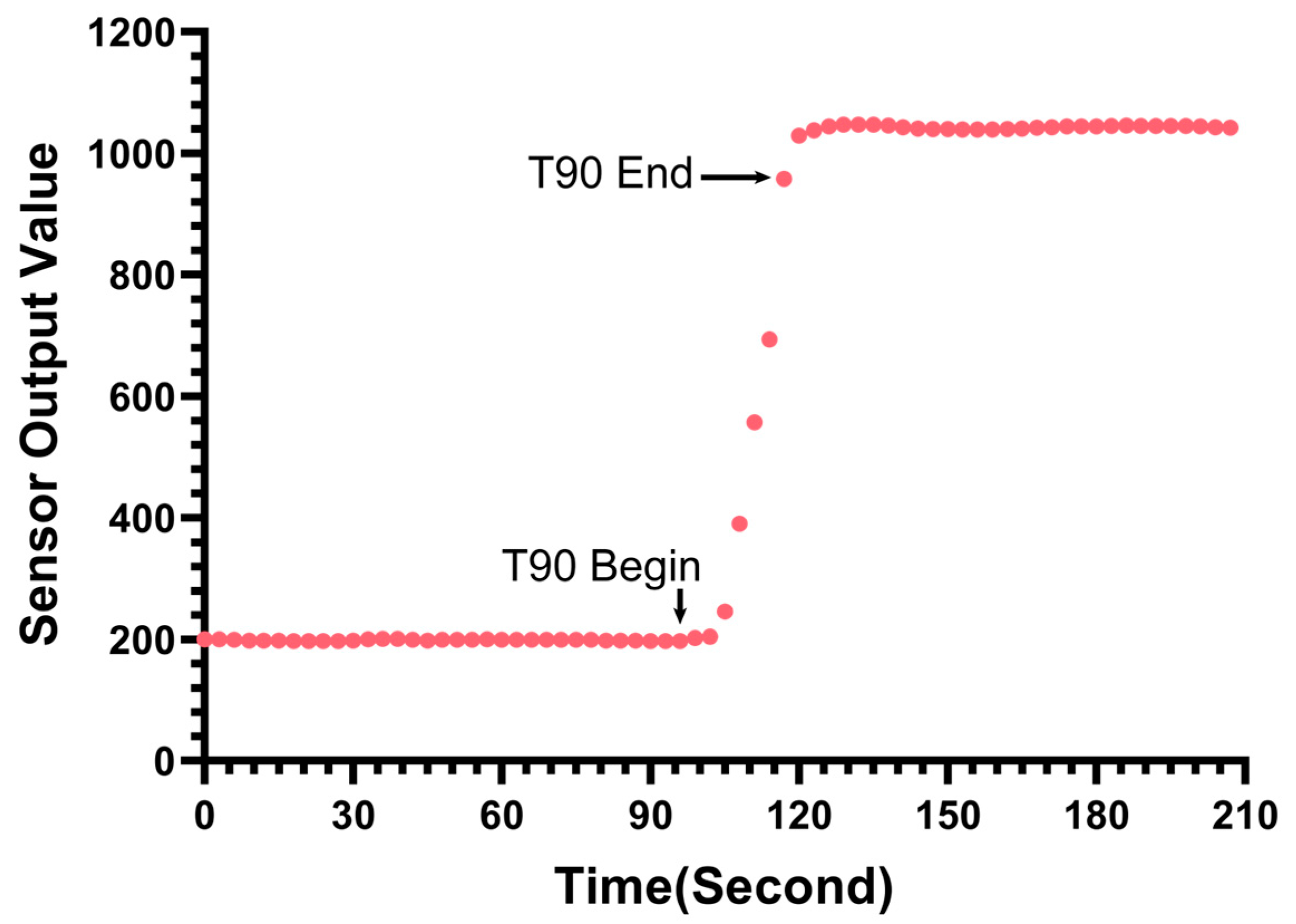 To accurately quantify the sensor’s transient response in a real-world scenario, a solution step-change experiment was conducted. The sensor was placed in a beaker containing ultrapure water under continuous magnetic stirring to ensure rapid mixing. A quantitative amount of fluorescein sodium stock solution was then instantly added to the beaker to achieve a final concentration of 1 μg/L. The sensor’s real-time output was recorded to determine the time required to reach a stable reading.
