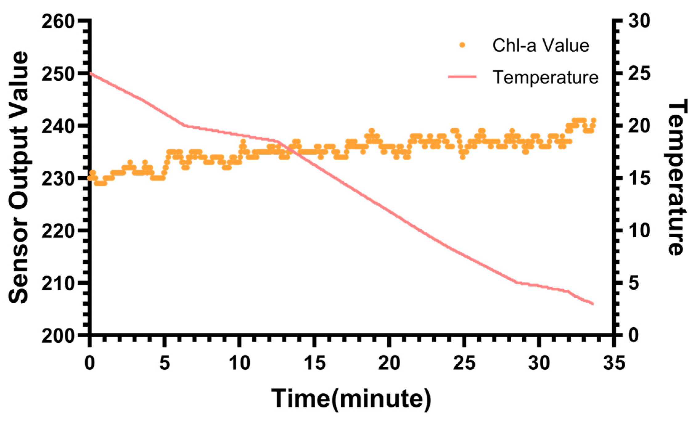 Figure 9 illustrates the results of this test as the temperature decreased from 25 °C to 3 °C, mimicking a deep-sea descent. It can be observed that the sensor’s output remained remarkably stable throughout the cooling process. The maximum fluctuation observed across the entire 22 °C range was limited to approximately 20 counts, corresponding to a chlorophyll equivalent variation of ~20 ng/L. Given the sensor’s LOD (4.82 ng/L), the Limit of Quantitation was approximately 14.5 ng/L. The observed thermal drift was only marginally above this LOQ threshold. This confirms that the temperature-induced baseline shift is comparable to the instrument’s intrinsic quantification limit and is effectively negligible for practical measurements.