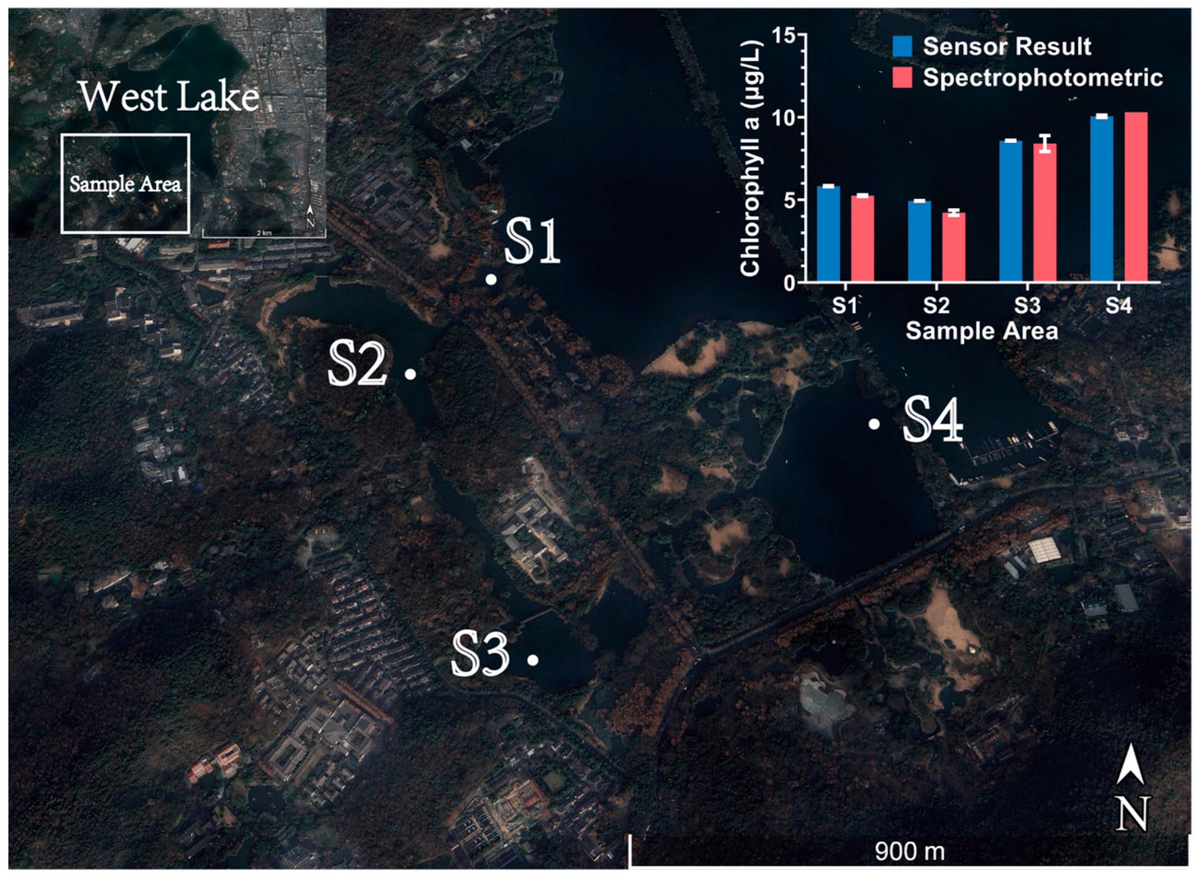 On 8 April 2025, the prototype was used for chlorophyll detection in the waters of West Lake, Hangzhou, with the detection point located at 30.271° N, 120.131° E. To verify the sensor’s performance, measurements were taken at four locations in West Lake near Wugui Islet, and corresponding water samples were collected. The concentrations of these samples were analyzed on the same day using the spectrophotometric method [