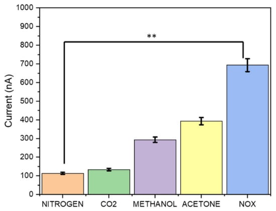 Extending the gas sensing technology to the detection of COVID-19 has emerged recently. The latest findings in this field are summarized as follows. Zhou et al. have designed a single-nickel-atom-based sensor for screening for COVID-19. This sensor can detect fractional exhaled nitric oxide (FeNO). It has shown highly sensitive detection of NO within the range of 0.3–180 ppb. Their finding has shown a strong correlation between FeNO and COVID-19 infection. Integrating FeNO with a machine learning model has facilitated differentiating healthy persons from COVID-19 patients. This work demonstrates a highly sensitive exhaled NO sensor for the detection of COVID-19 in a simplified and affordable approach [101]. Banga et al. have demonstrated a breath-analyzer-based sensor for the detection of NO gas in the range of 50 to 250 ppb. They have exploited the use of room temperature ionic liquid (RTIL) for accelerating the diffusion of NO gas. 1-Ethyl-3-methylimidazolium Tetrafuoroborate ([EMIM]BF4) has been used as an IL. The amount of electrical current generated in the sensor was used to distinguish between negative and positive COVID-19. This work demonstrates the significance of ionic liquids to improve the NO sensing ability of the sensor, which has enabled the rapid detection of COVID-19 in a portable prototype design [104]. The sensitivity of the sensor against various gases shows that the highest performance was observed for NO detection (Figure 4).
