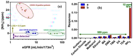 Kamalabadi et al. have focused on designing a novel chemiresistor gas sensor for detection of NH3 in EB of COVID-19 patients suffering from acute kidney injury (AKI). The sensor was fabricated as a thin film of polypyrrole/silver nanoparticles integrated with gold interdigital electrodes (Au-IDEs/S-PPyMPs/AgNPs). It exhibited NH3 detection in the range of 1.00−19.23 ppm. Applying this sensor for COVID-19 patients has demonstrated encouraging accuracy for NH3 detection. Figure 7a shows that NH3 content in COVID-19 was significantly higher as compared to healthy individuals. The designed sensor has shown high sensitivity for NH3 as compared to other compounds such as CO2, acetone, ethanol, and methanol. A highly intense response was noticed even with a lower concentration of NH3 (10 ppm), but other compounds with a much higher concentration (500 ppm) have shown negligible signal intensity (Figure 7b). This reflects a higher selectivity of the sensor for NH3 detection and minimal interference from other compounds. The incorporation of Ag NP in Au-IDEs/S-PPyMPs has particularly enhanced the sensitivity. It has resulted in 13-fold improvement in the signal as compared to pristine Au-IDEs/S-PPyMPs. This study demonstrates a simplified non-invasive approach based on NH3 detection for COVID-19 patients suffering from kidney disease [93]. Shan et al. have fabricated a multiplexed nanomaterial-based sensor for the detection of COVID-19 through EB analysis. The electrodes were prepared by photolithography on a silicon wafer. Gold nanoparticles (GNP) coated with organic ligands were printed on the electrodes. The designed sensor was applied to monitor VOC biomarkers in EB of COVID-19 infection. Sensor operation was based on detecting the change in its electrical resistance on exposure to VOCs in EB. Clinical investigations were carried out by comparing the sensor response for COVID-19-infected patients, as well as control samples of non-infected individuals. It has demonstrated accurate analysis to distinguish between infected and non-infected individuals. Results obtained by using this approach were comparable to the conventionally adopted RT-PCR method.