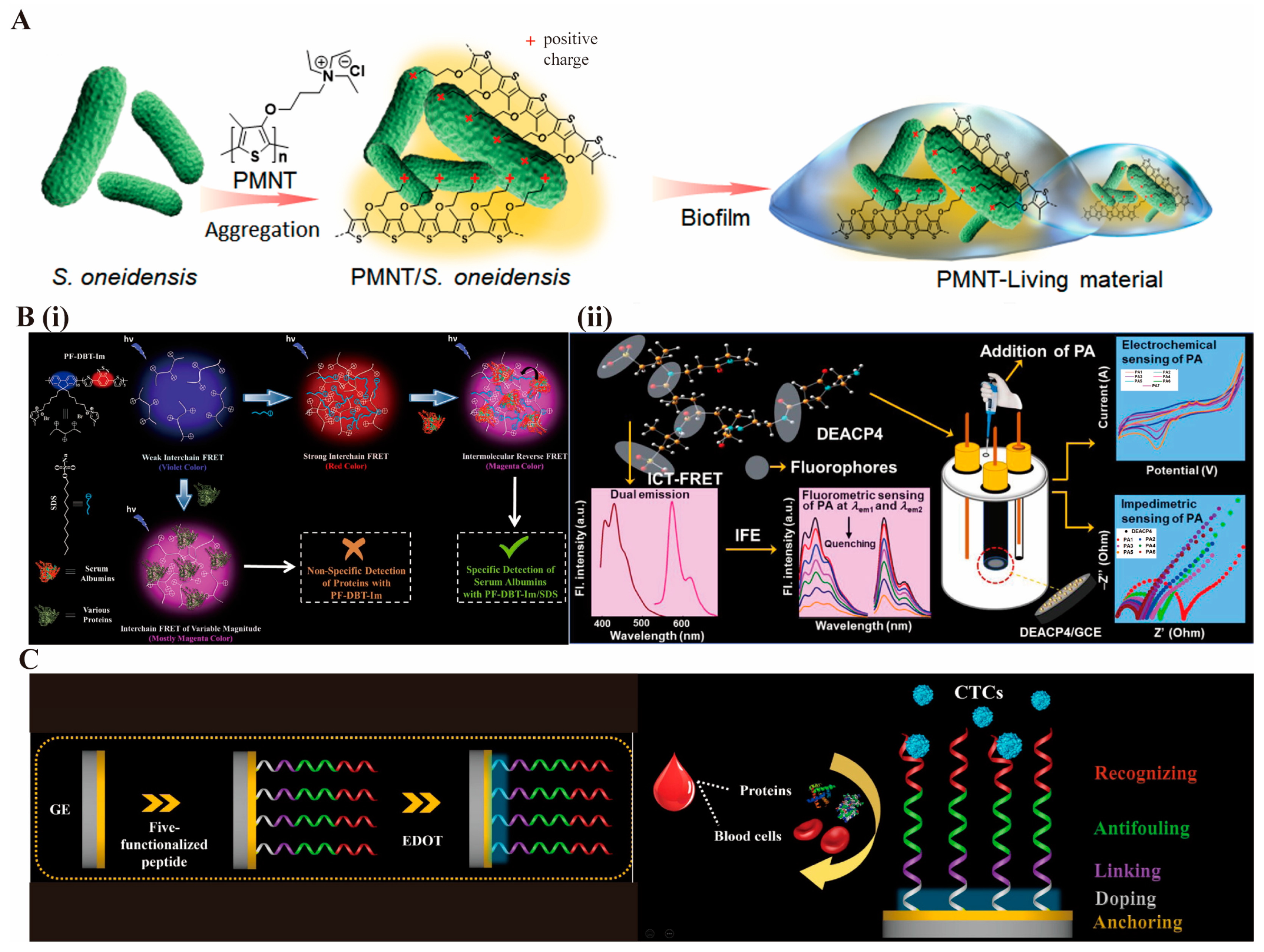 - Wang, Z.; Bai, H.; Yu, W.; Gao, Z.; Chen, W.; Yang, Z.; Zhu, C.; Huang, Y.; Lv, F.; Wang, S. Flexible Bioelectronic Device Fabricated by Conductive Polymer–Based Living Material. Sci. Adv. 2022, 8, eabo1458. [Google Scholar] [CrossRef] [PubMed]