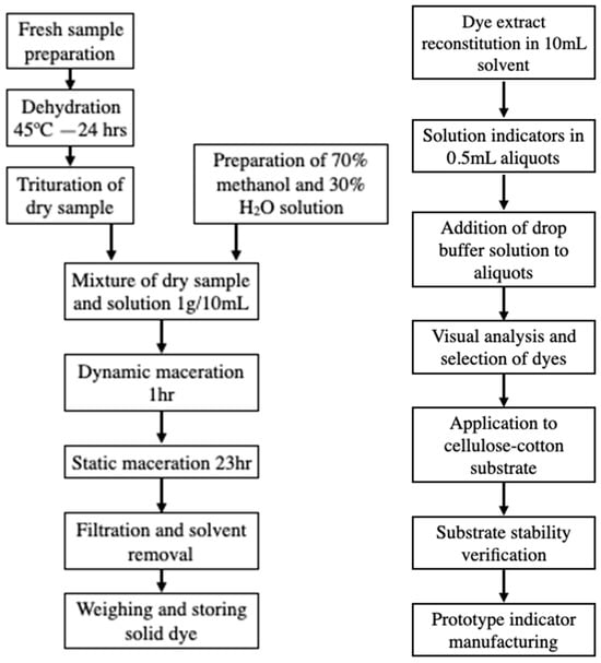 The experimental process began with the selection of 40 plant species readily available in the Ecuadorian market. The criteria for selection were (1) non-endangered status, ensuring compliance with environmental and conservation regulations, and (2) accessibility in local markets to ensure potential reproducibility and scalability. The selected species included a variety of edible fruits, vegetables, flowers, and spices traditionally used for their natural pigmentation (see Table 1).
