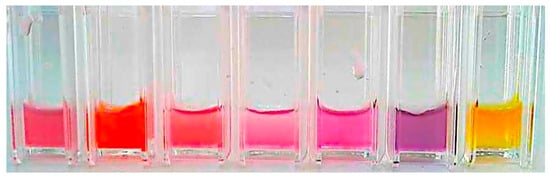 A visual inspection was then carried out under standardized lighting conditions, using a white background and a cold white LED light (BR30, 65W, Sunco, CA, USA) from the same distance and position, to evaluate chromatic transitions. Pigments showing clearly distinguishable color changes across multiple pH levels were considered as preselected candidates (see Figure 2).