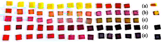 Side-by-side photograph of paper-based pH test pads for five dye systems (rows (a–e)). Rows (a–e) correspond to five distinct natural dye extracts (from top to bottom): turmeric, radish, purple cabbage pigment extracted with water, hibiscus, and purple cabbage. Within each row, pads are ordered from lower to higher pH (left to right), illustrating the changes in hue and intensity across the selected pH set.