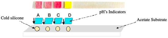 Assembly of the acetate-based test strip, showing the four dye-impregnated pads (A–D) mounted with cold silicone on the acetate substrate prior to pH exposure.