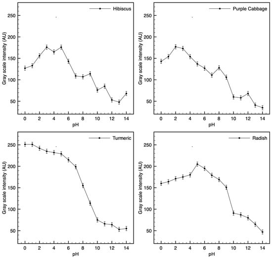 Grayscale intensity versus pH (0–14) for each dye: Hibiscus, Purple cabbage, Turmeric, and Radish. Curves show the mean pixel intensity (arbitrary units) with error bars indicating the standard deviation from (n = 3) replicate pads per pH. Non-monotonic segments reflect dye-specific hue changes captured in grayscale.