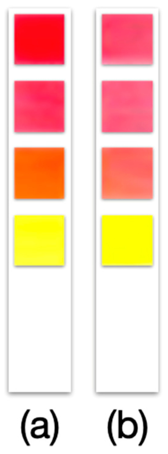 Prototype of pH test strip assembled with four 50% cotton:50% cellulose papers of 5 × 5 mm impregnated with natural organic dye. (a) Freshly manufactured and (b) after 30 days of storage at 22 ± 5 °C, humidity 30 ± 5%, and light and darkness cycles of 12 h/12 h.