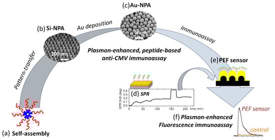 Anti-CMV detection is generally carried out using enzyme-linked immunosorbent assays (ELISAs) [9]. Polymerase chain reaction (PCR) or reverse transcriptase–quantitative PCR (RT-qPCR) is often used for diagnosis of congenital CMV infection [10]. Other reported alternatives include surface plasmon resonance (SPR) [11], quartz crystal microbalance (QCM) [12], Raman [13], and electrochemical sensing [14]. Amongst these, nanoplasmonic sensors based on plasmon-enhanced fluorescence (PEF) sensors are particularly interesting, as they bring high sensitivity, quick turnaround times, ease of multiplexing as microarrays, and ease of miniaturization into point-of-care configurations [15,16,17,18,19]. PEF sensors address the conventional limitations of ELISA [20,21] or PCR [22,23], including the long time to obtain results, cumbersome laboratory procedures, and high cost per measurement. They also address the limitations of SPR or QCM, with regard to their large measurement footprints, higher sample consumption, size that is less adapted to point of care configurations, and relatively high cost of ownership. However, advancement in PEF sensing requires better control over the size, shape, density, and distribution of electromagnetic hotspots to control both electromagnetic field distributions as well as how the analyte is distributed with respect to the hotspots. Furthermore, the ability to produce PEF sensors using quality-assured, scalable, and cost-effective approaches is important to deliver higher value and lower cost per measurement. We earlier showed gold nanoarrays of different geometries, including arrays of nanorods, nanodiscs, nanoparticle clusters, and nanopillars, and their application to plasmon-enhanced Raman and fluorescence sensing [24,25,26,27,28,29]. These arrays can be produced using self-assembly of block copolymer colloids, on full-wafer areas, and are adapted to further scalability using high-throughput techniques like nanoimprint lithography. We showed, for the first time, the use of self-assembly-derived high-density gold nanopillar arrays (Au NPAs) toward plasmon-enhanced fluorescence detection of anti-CMV antibodies using short-chain linear peptides as capture agents.